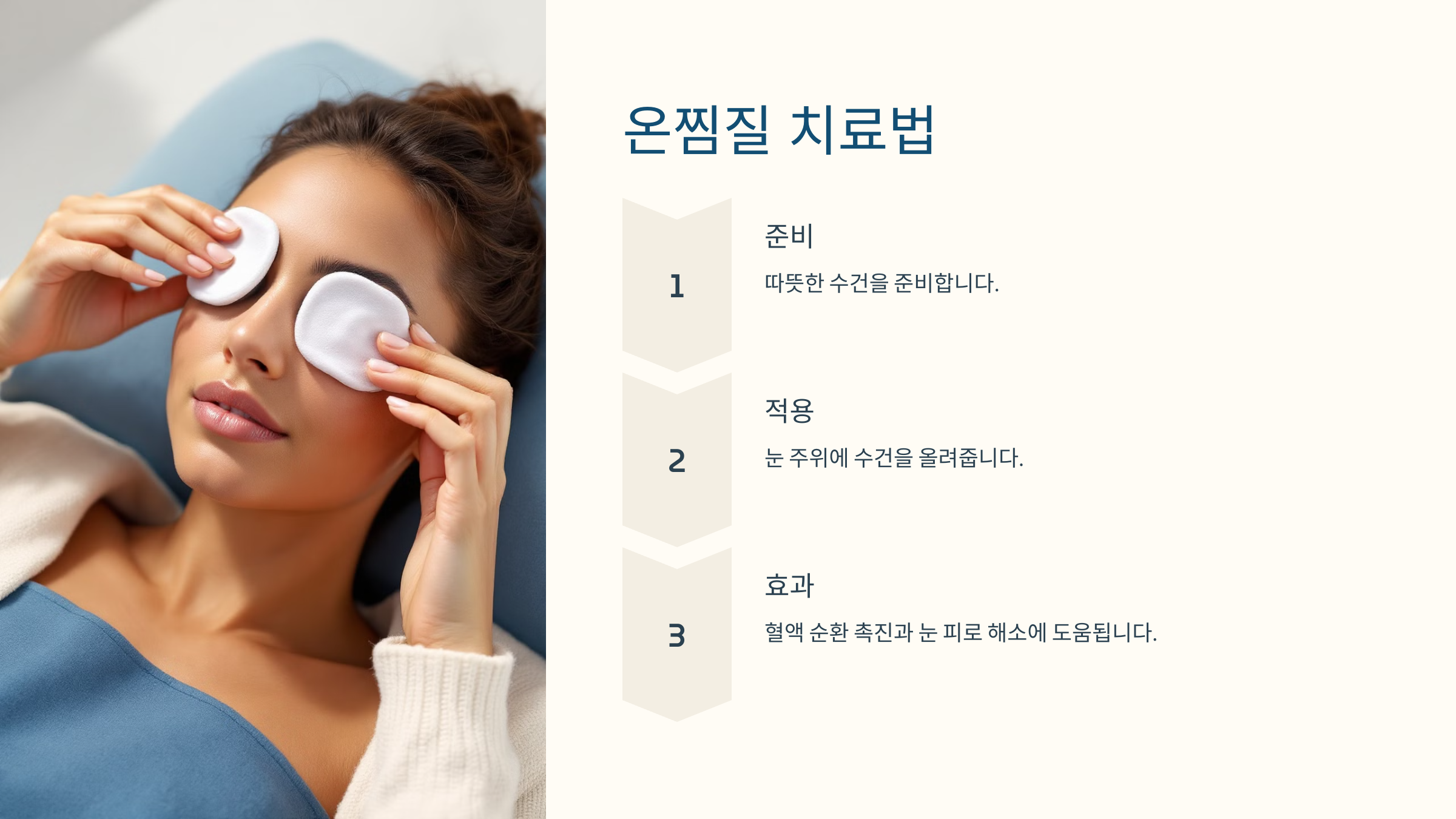 따뜻한 수건을 눈 주위에 올려주면 눈 주위의 혈액 순환을 촉진하고 눈의 피로를 풀어줘요. 매일 꾸준히 해주면 큰 효과를 볼 수 있어요.
