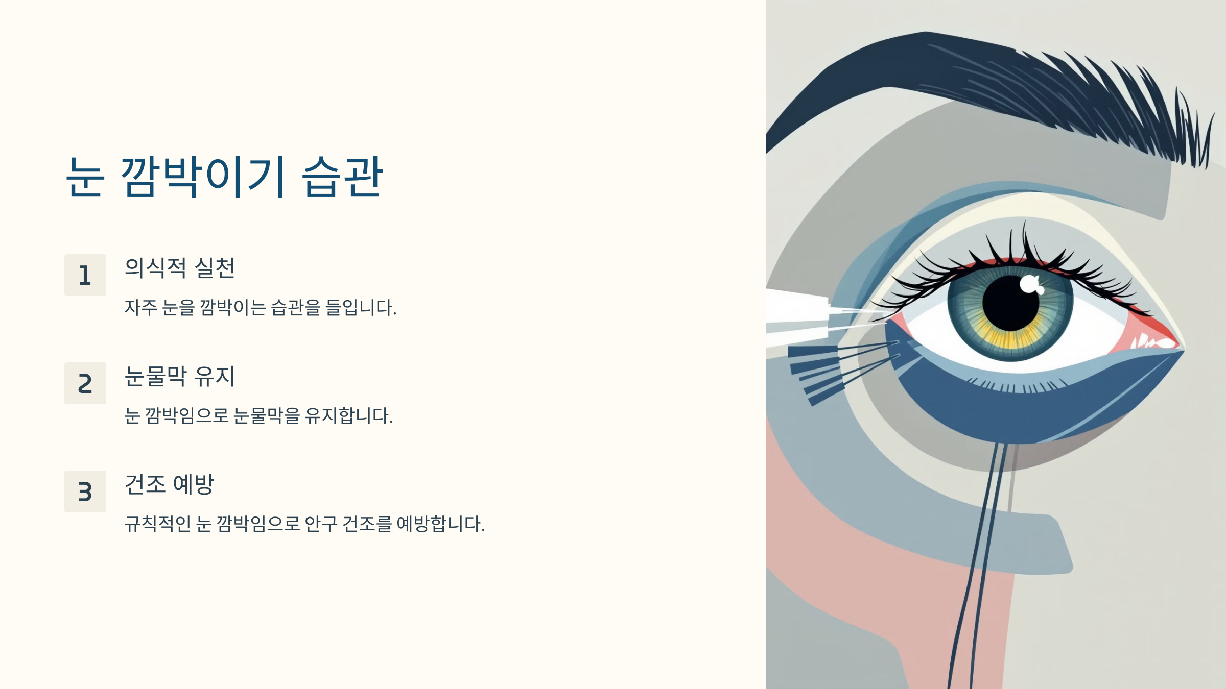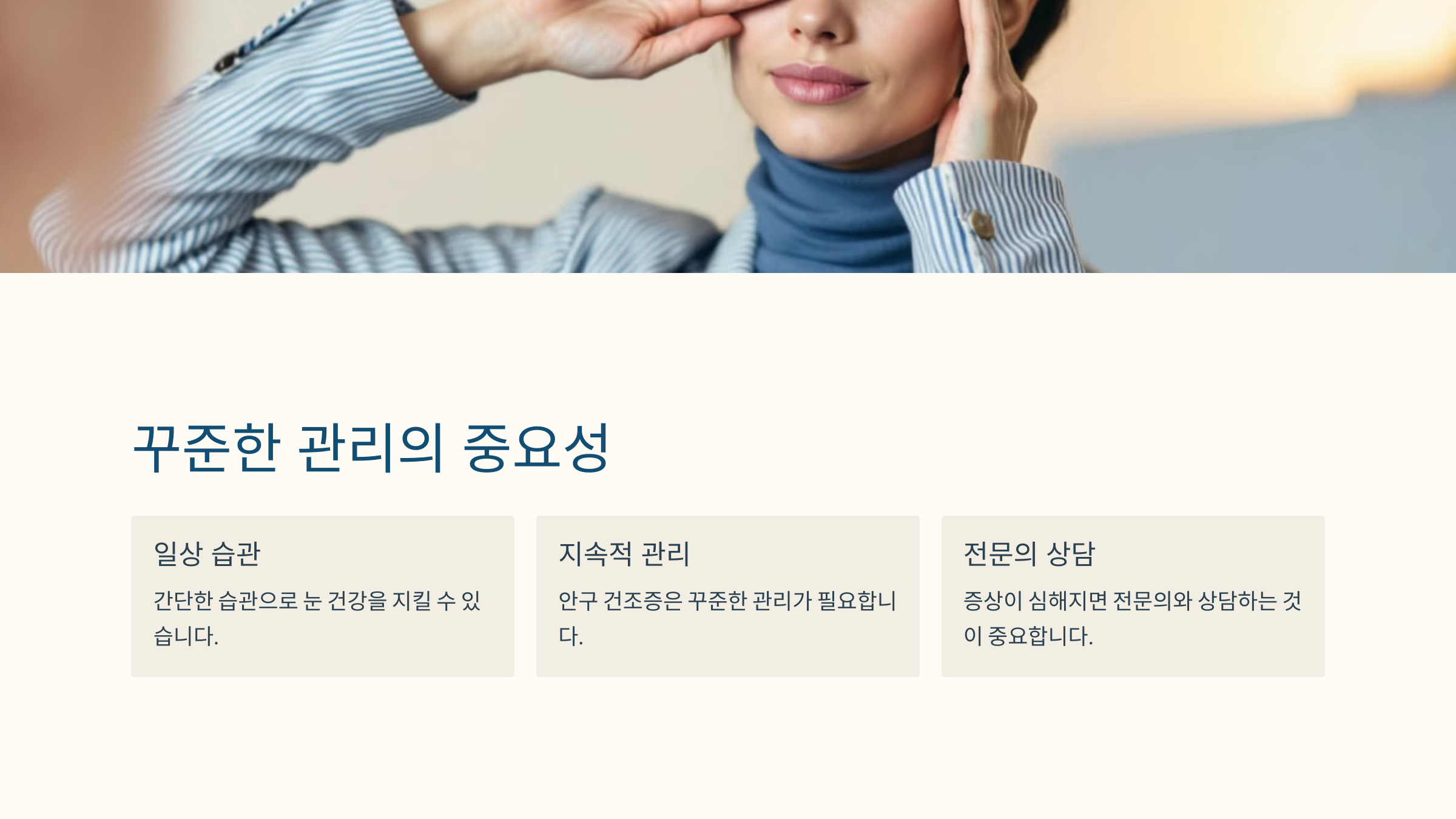 안구 건조증은 한두 번의 관리로 끝나는 것이 아니에요. 꾸준한 관리가 필요하답니다! 생활 속에서 간단한 습관만 잘 지켜도 눈 건강을 지킬 수 있으니, 오늘부터 바로 실천해보세요. 그리고 만약 증상이 심해지거나 개선되지 않는다면, 전문의와 상담하는 것이 중요하다는 점도 잊지 마세요.