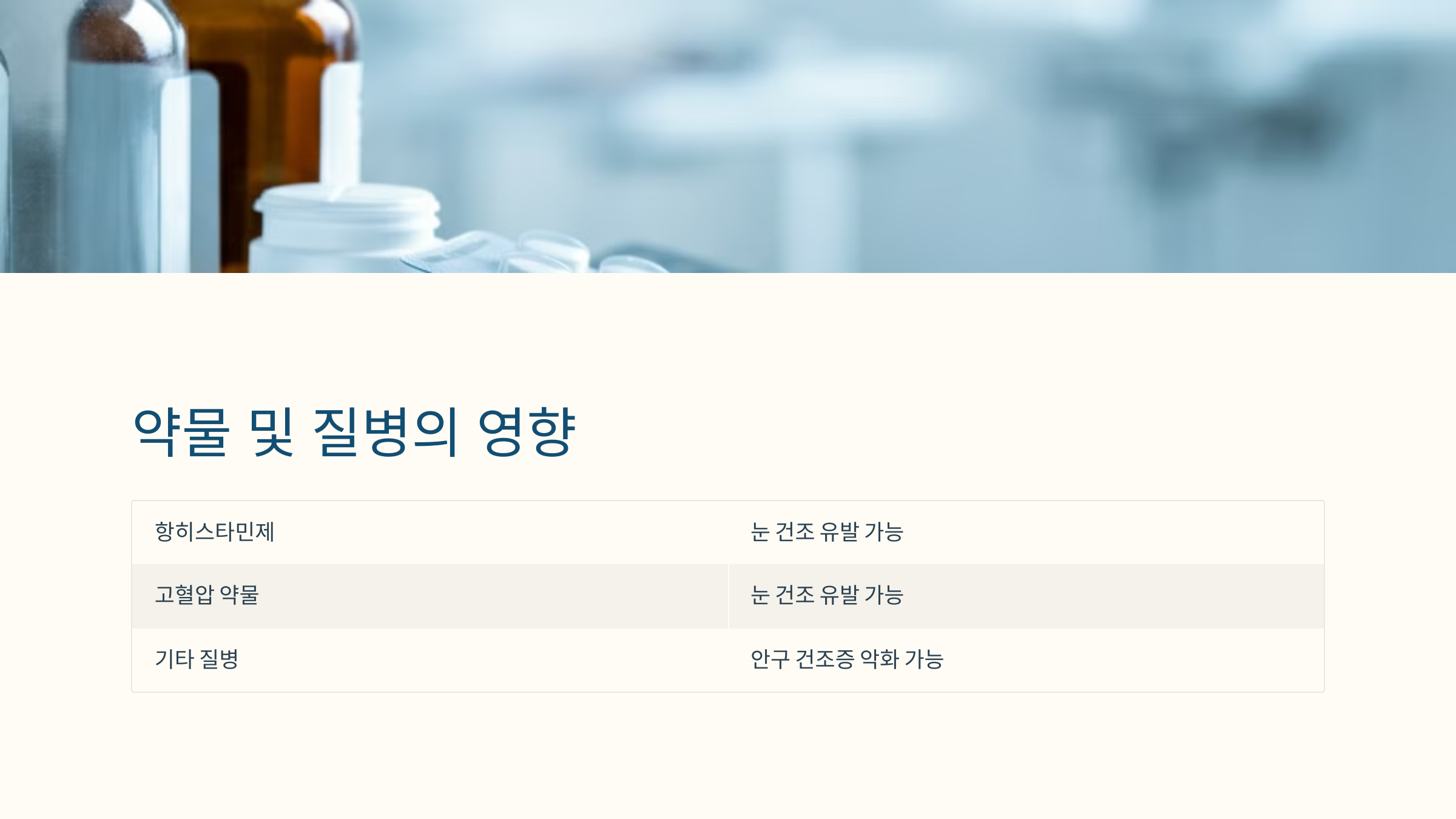 특정 약물이나 건강 상태도 안구 건조를 유발할 수 있어요. 예를 들어, 항히스타민제나 일부 고혈압 약물은 눈을 건조하게 만들 수 있으니 주의해야 해요.