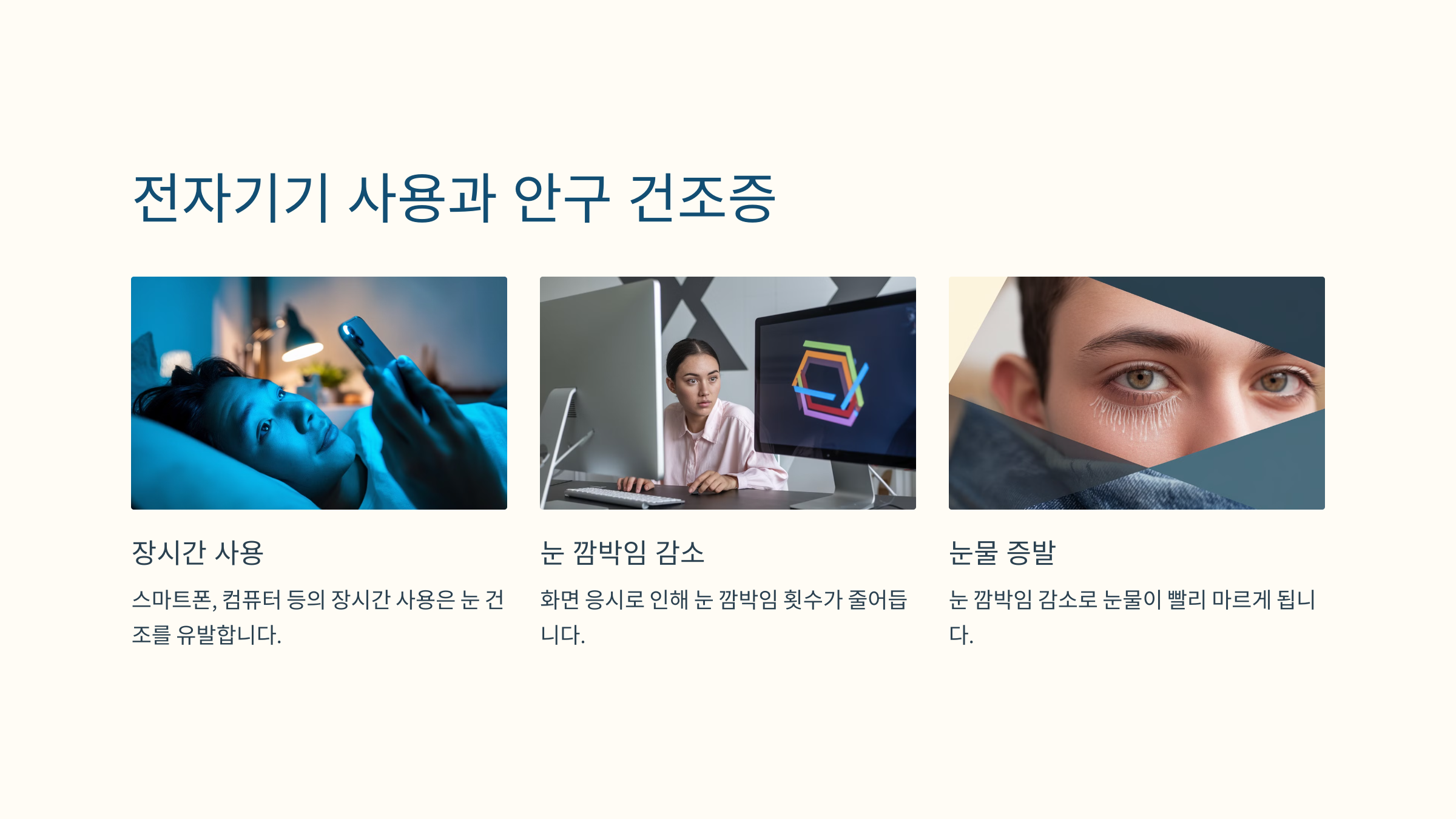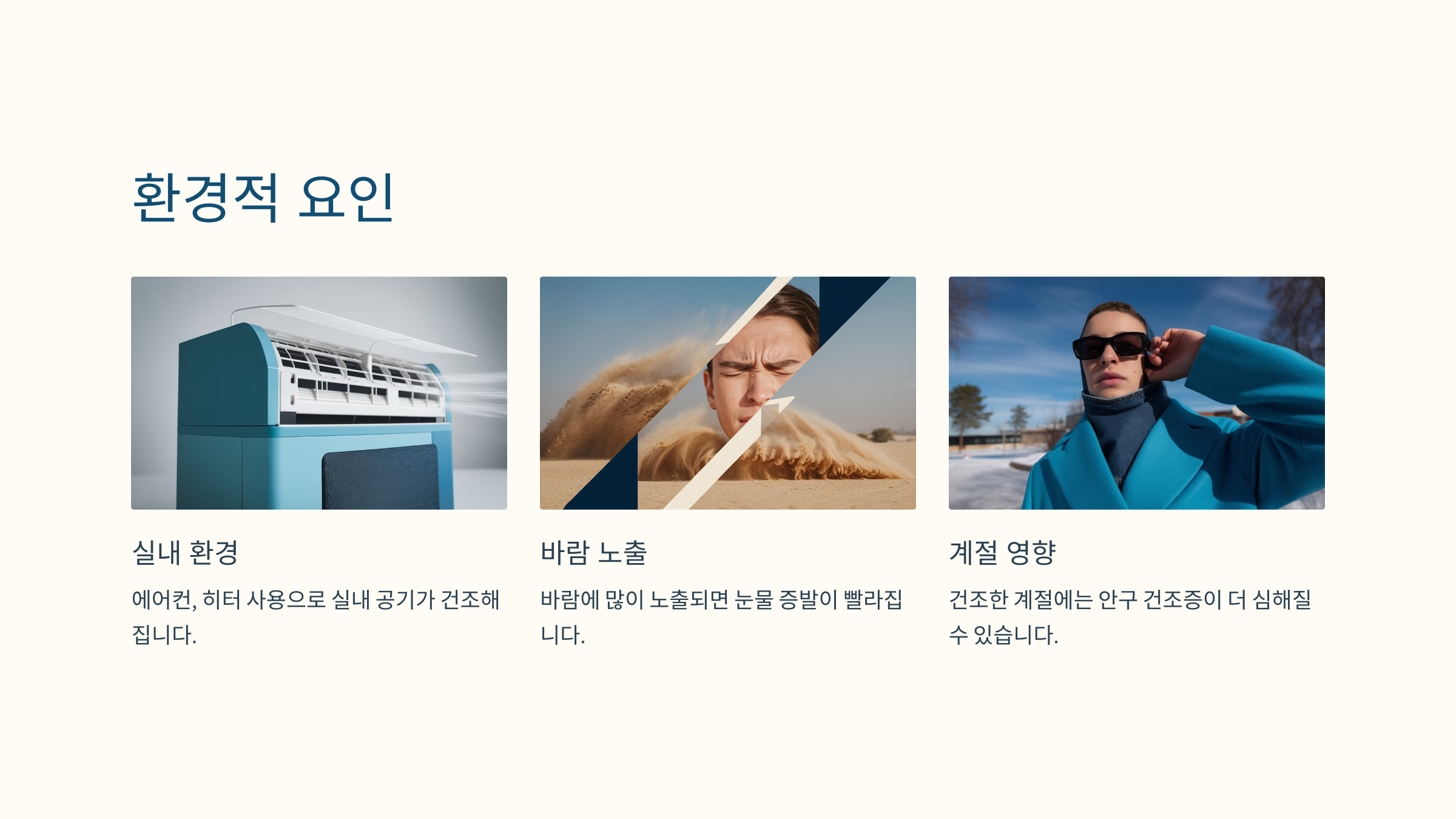 에어컨이나 히터를 많이 사용하는 실내 환경, 바람에 많이 노출되는 상황에서도 안구 건조증이 발생할 수 있어요. 특히 요즘같이 건조한 계절에는 눈이 더 쉽게 건조해질 수 있으니 주의해야 해요.