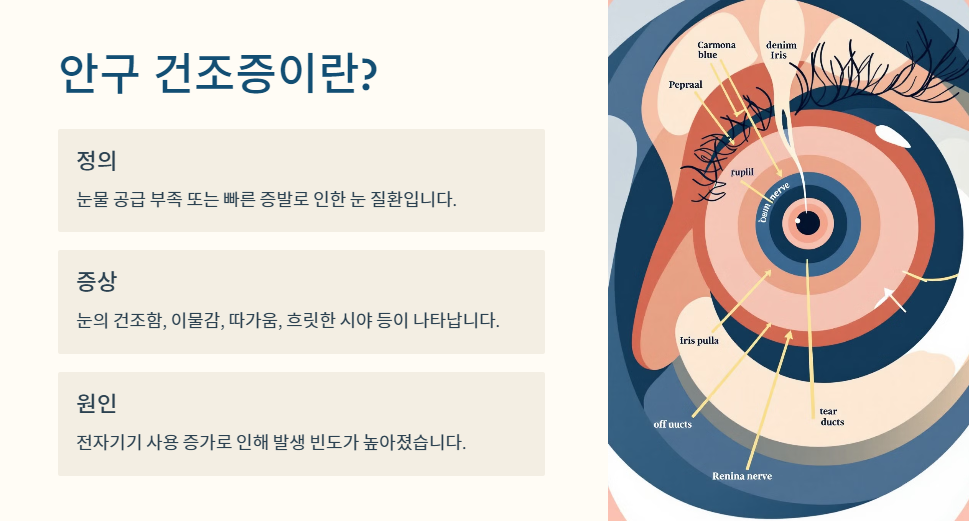 먼저 안구 건조증이 무엇인지부터 알아볼게요. 안구 건조증은 눈에 충분한 눈물이 공급되지 않거나 눈물이 너무 빨리 증발할 때 발생하는 질환이에요. 요즘엔 스마트폰이나 컴퓨터 같은 전자기기 사용이 많아지면서 이런 문제를 겪는 사람들이 정말 많아졌어요.