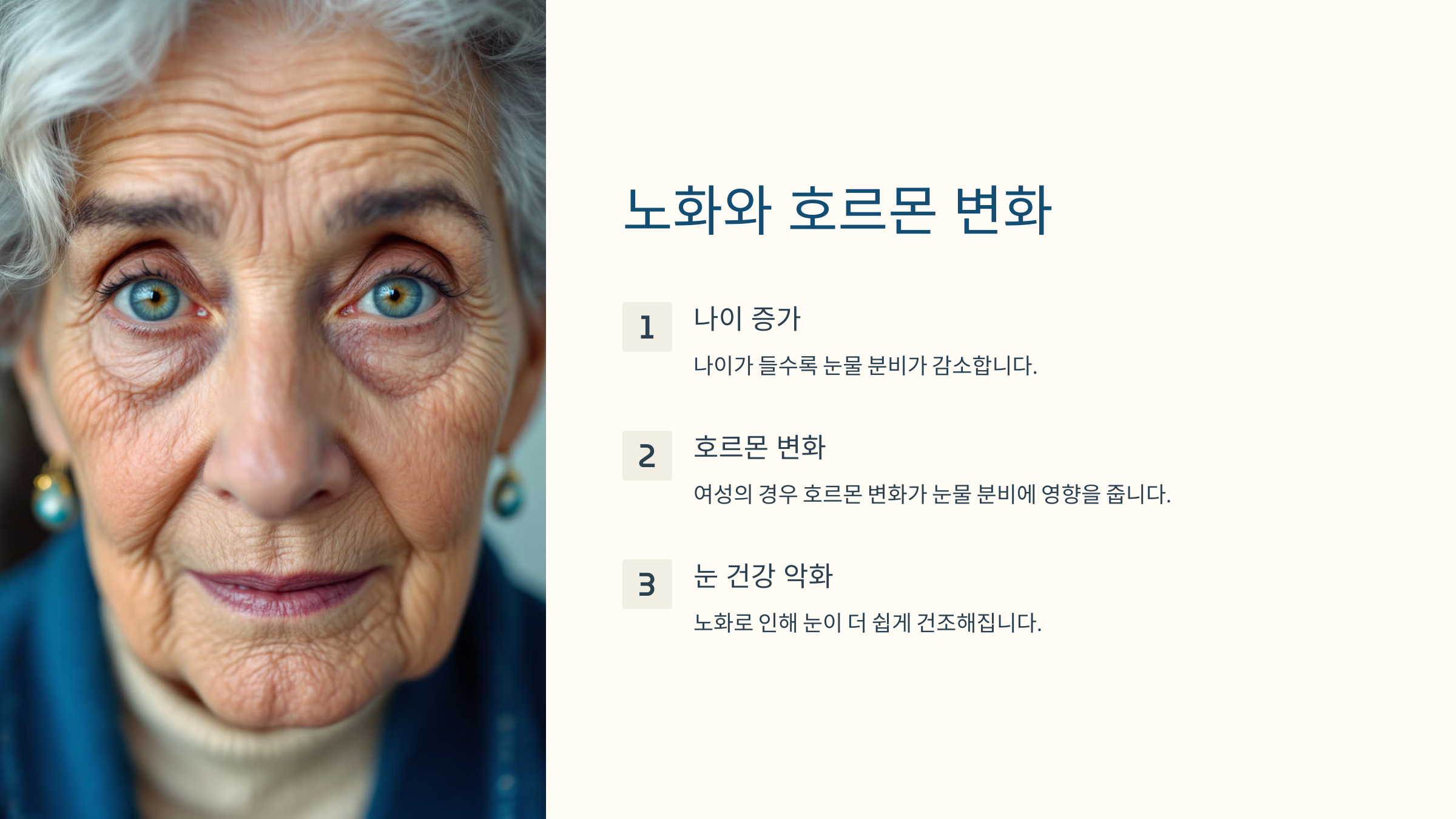 특히 여성분들! 나이가 들면서 호르몬 변화가 눈물 분비에 영향을 미칠 수 있어요. 그래서 나이가 들수록 눈이 더 쉽게 건조해지는 경향이 있답니다.