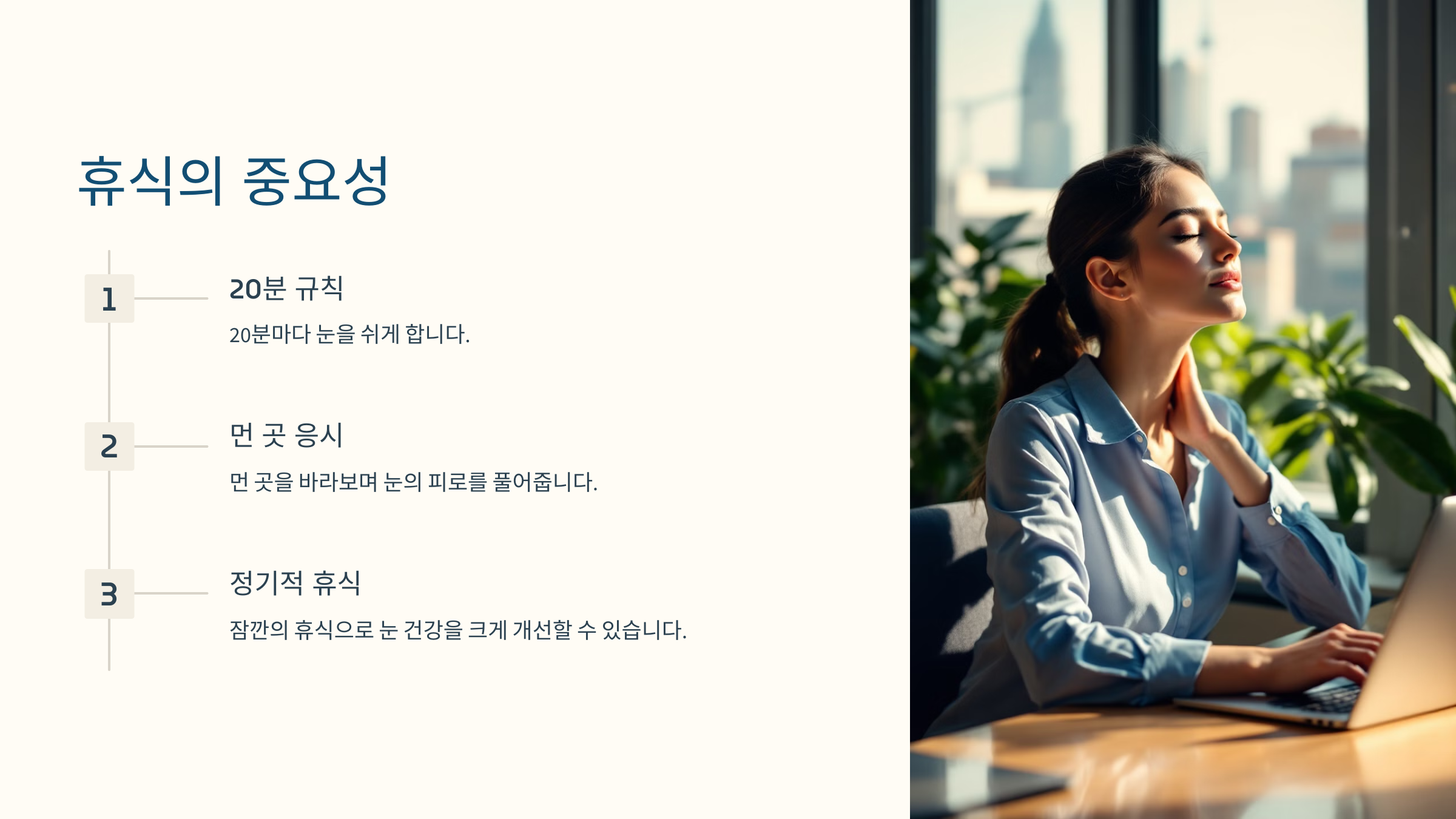 전자기기 사용 시에는 꼭 20분마다 눈을 쉬게 해주고, 먼 곳을 바라보는 것도 눈 건강에 도움이 돼요. 잠깐의 휴식이 눈 건강을 크게 개선할 수 있답니다.