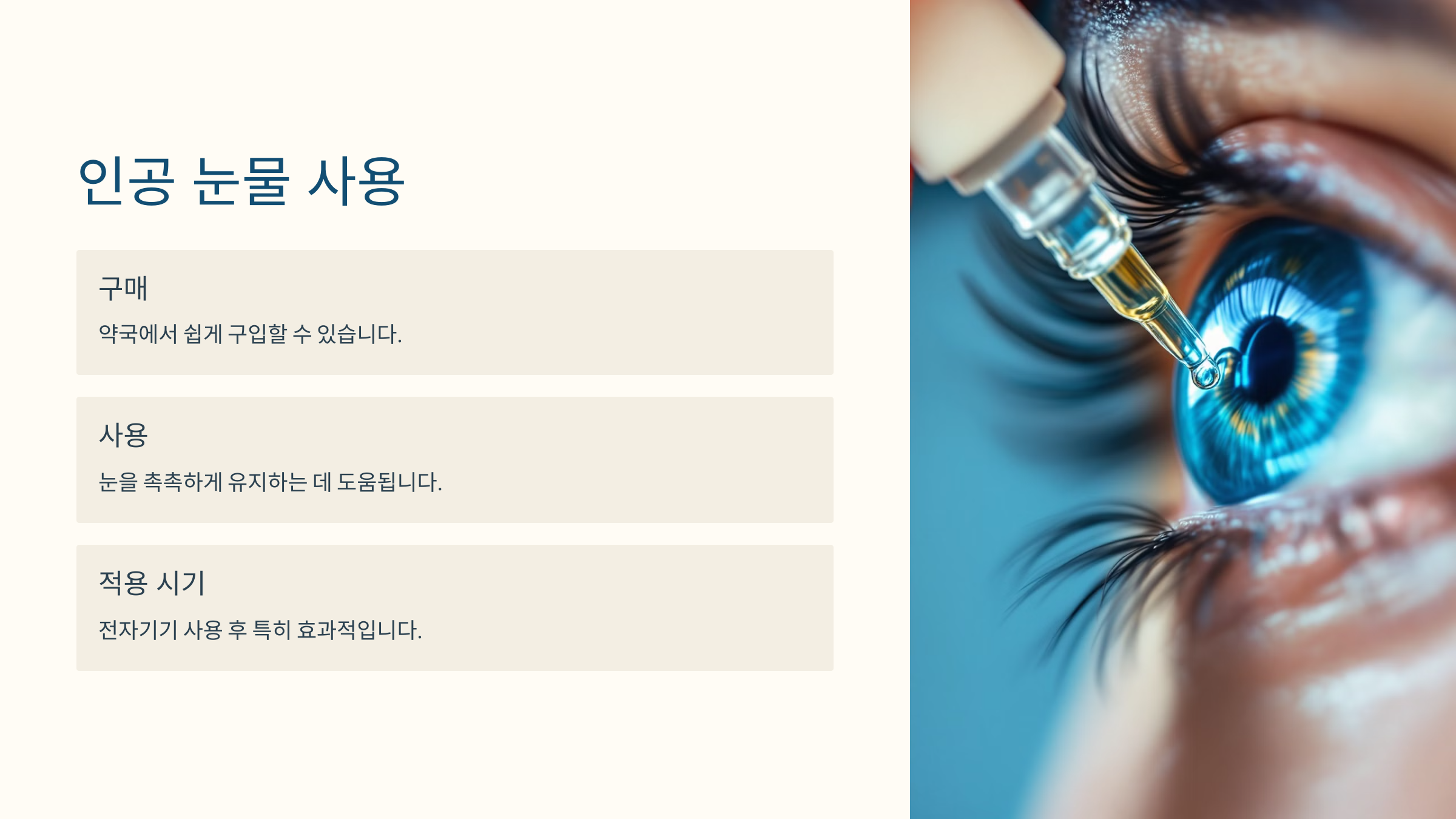 약국에서 쉽게 구할 수 있는 인공 눈물을 사용하면 눈을 촉촉하게 유지할 수 있어요. 특히 전자기기 사용 후에는 인공 눈물로 눈을 관리해주면 좋아요.