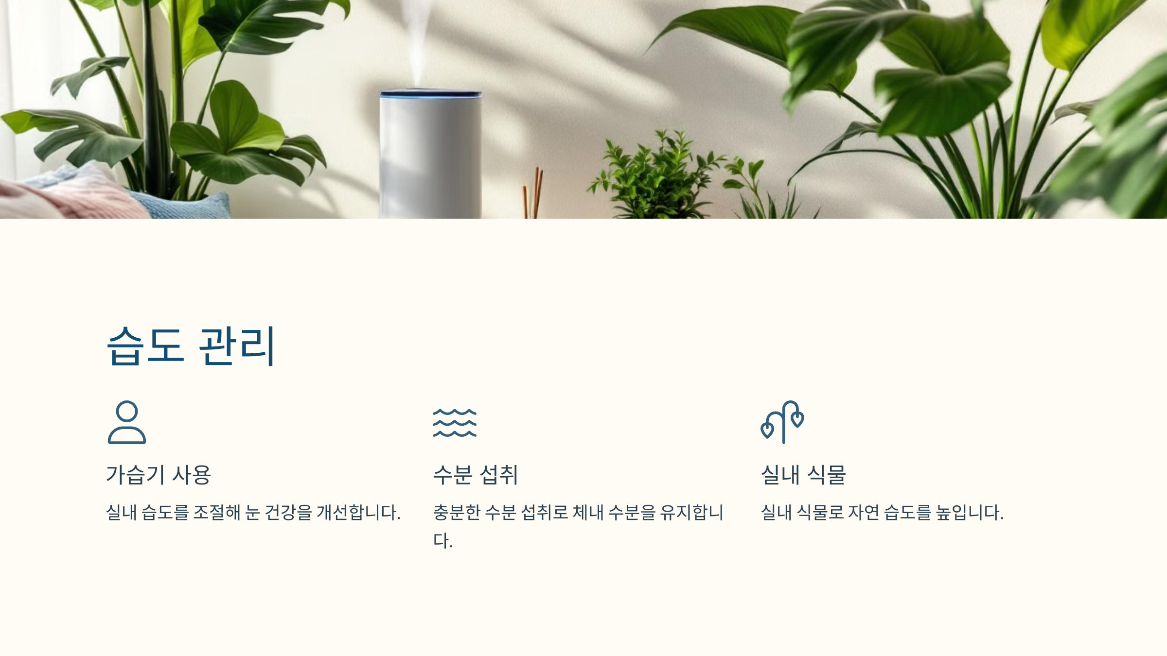 실내 공기가 건조하면 눈도 더 빨리 건조해질 수 있어요. 이럴 때는 가습기를 사용해 실내 습도를 조절해 주면 눈 건강에 도움이 돼요.