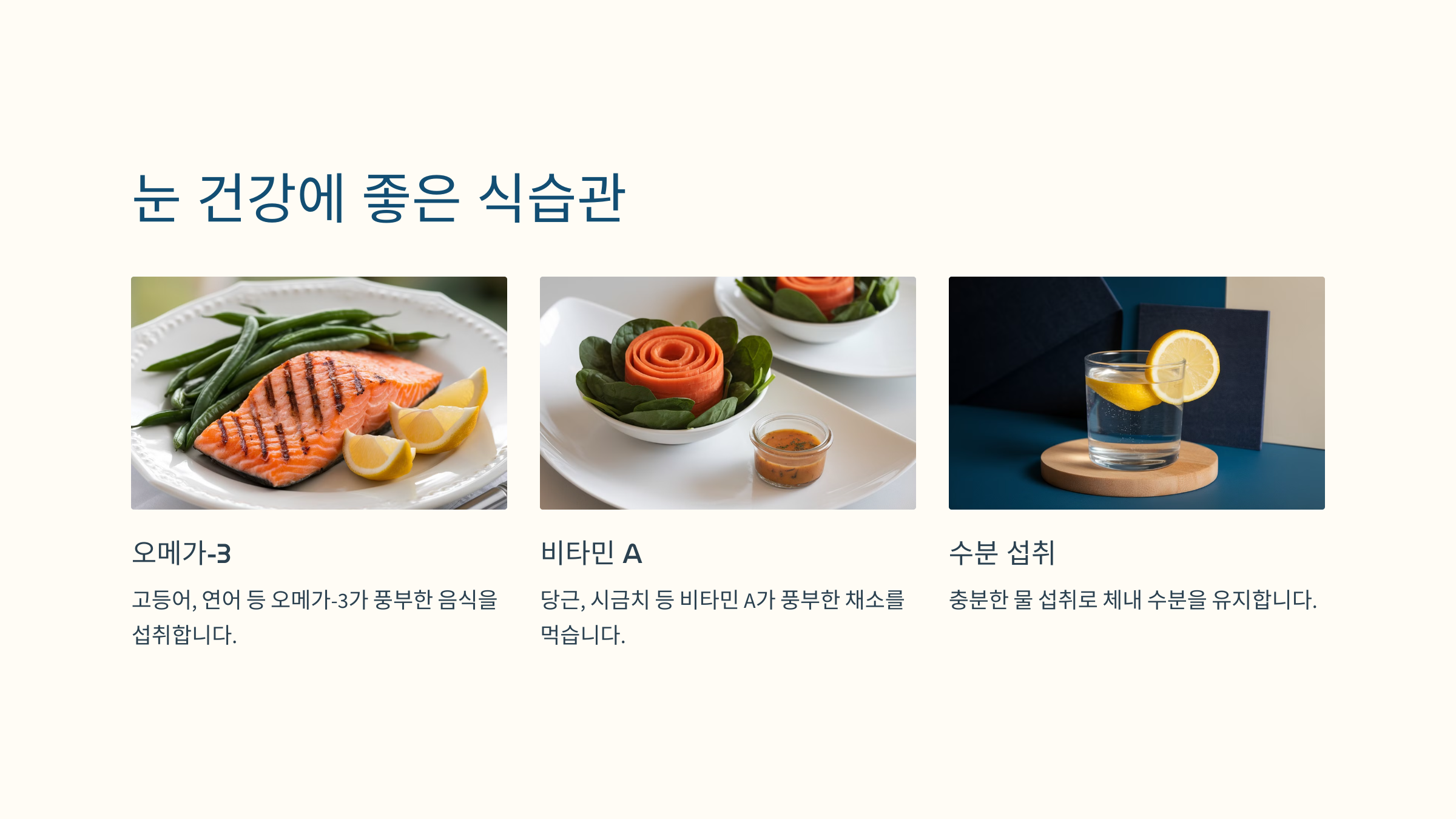 A5: 오메가-3가 풍부한 음식을 추천드려요. 오메가-3는 눈 건강에 도움을 줄 수 있는 필수 영양소랍니다. 연어, 고등어, 아마씨 오일 등이 대표적인 음식이에요. 평소에 이런 음식을 꾸준히 섭취하면 눈 건강을 유지하는 데 도움이 될 거예요.