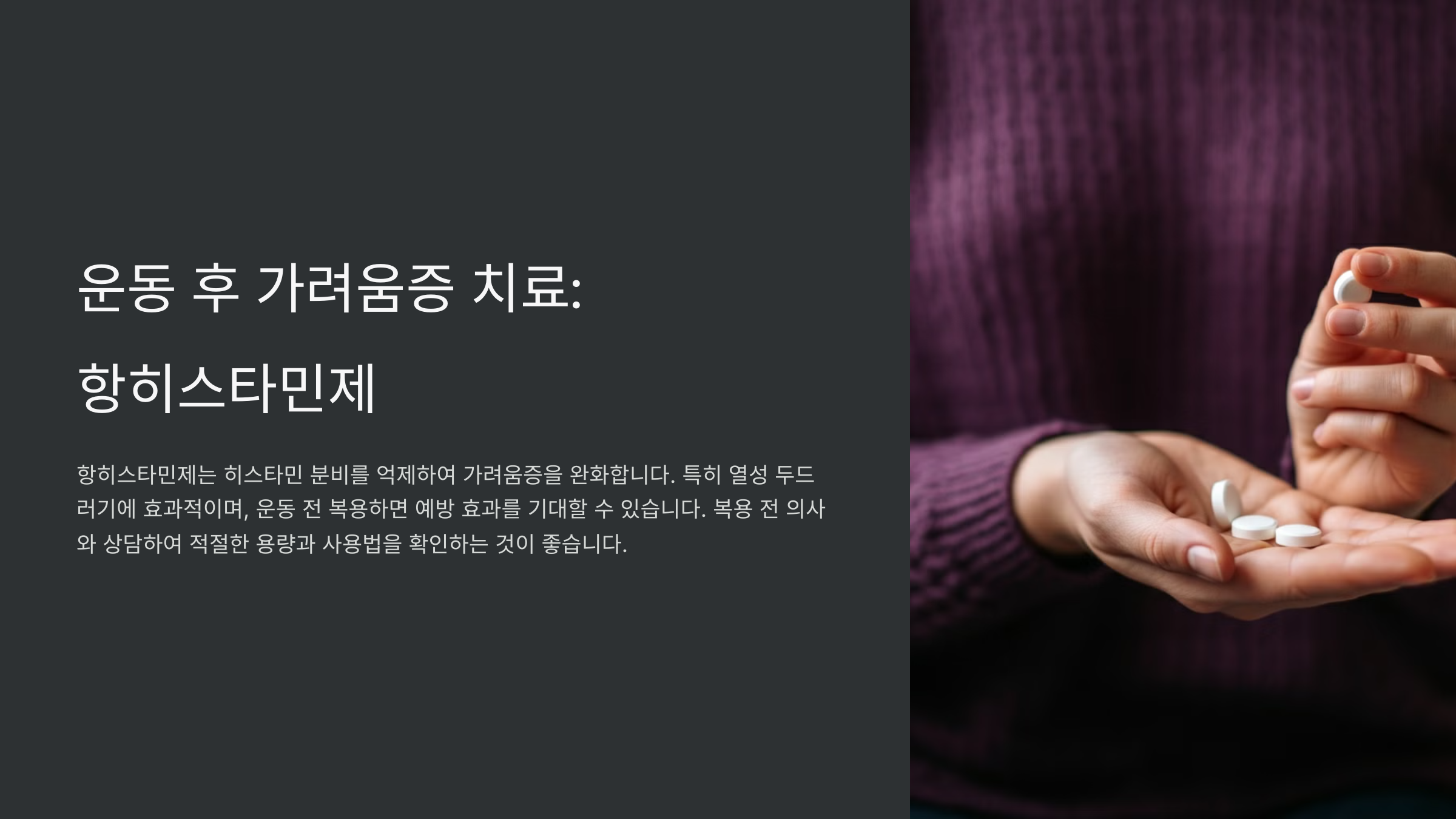 운동 후 가려움증을 자주 겪는다면, 운동 전에 항히스타민제를 복용하는 것이 도움이 될 수 있습니다. 항히스타민제는 운동 중 분비되는 히스타민을 차단하여 가려움증을 예방하는 역할을 합니다. 특히 열성 두드러기와 같은 증상 완화에 효과적이며, 운동 후 피부 반응을 줄이는 데 도움이 됩니다.