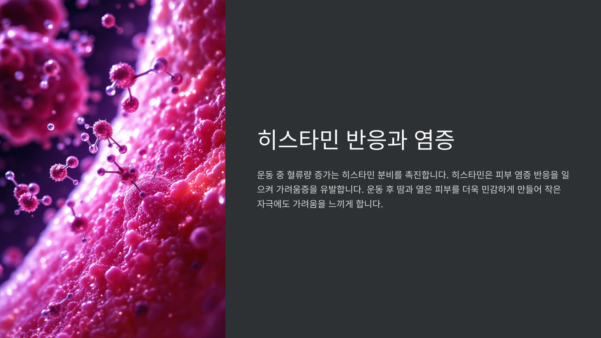 운동을 할 때 혈액 순환이 활발해지면 피부 세포에서 히스타민이라는 화학 물질이 분비됩니다. 히스타민은 혈관을 확장시키고 염증 반응을 일으켜 가려움증을 유발하는데, 이는 운동 중 가려움증의 중요한 원인 중 하나입니다. 운동으로 인해 체온이 상승하고 피부가 더 민감해지면, 히스타민 반응은 더욱 강하게 나타날 수 있습니다.