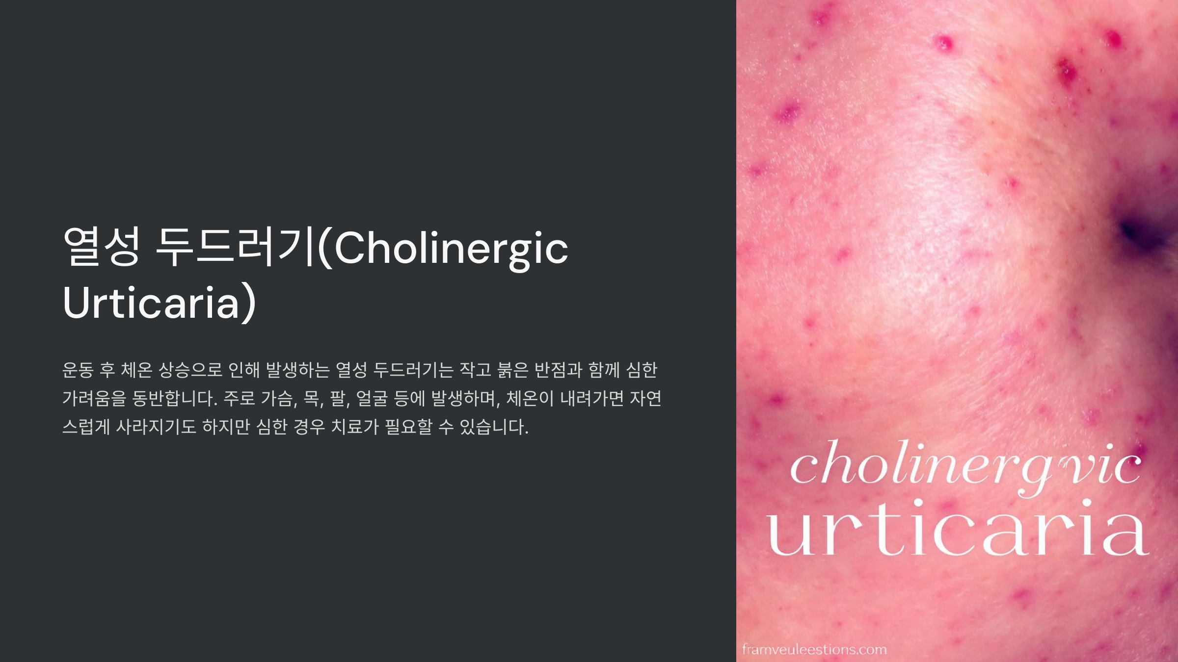 열성 두드러기는 체온이 급격히 상승할 때 나타나는 두드러기의 일종으로, 운동 후 나타날 수 있는 피부 반응입니다. 이 상태에서는 작은 붉은 반점과 함께 강한 가려움증이 발생할 수 있으며, 특히 가슴, 목, 팔 부위에서 두드러지게 나타납니다. 열성 두드러기는 체온 조절과 자율신경계 반응으로 인해 발생하며, 운동으로 인해 체온이 급상승할 때 주로 나타납니다.