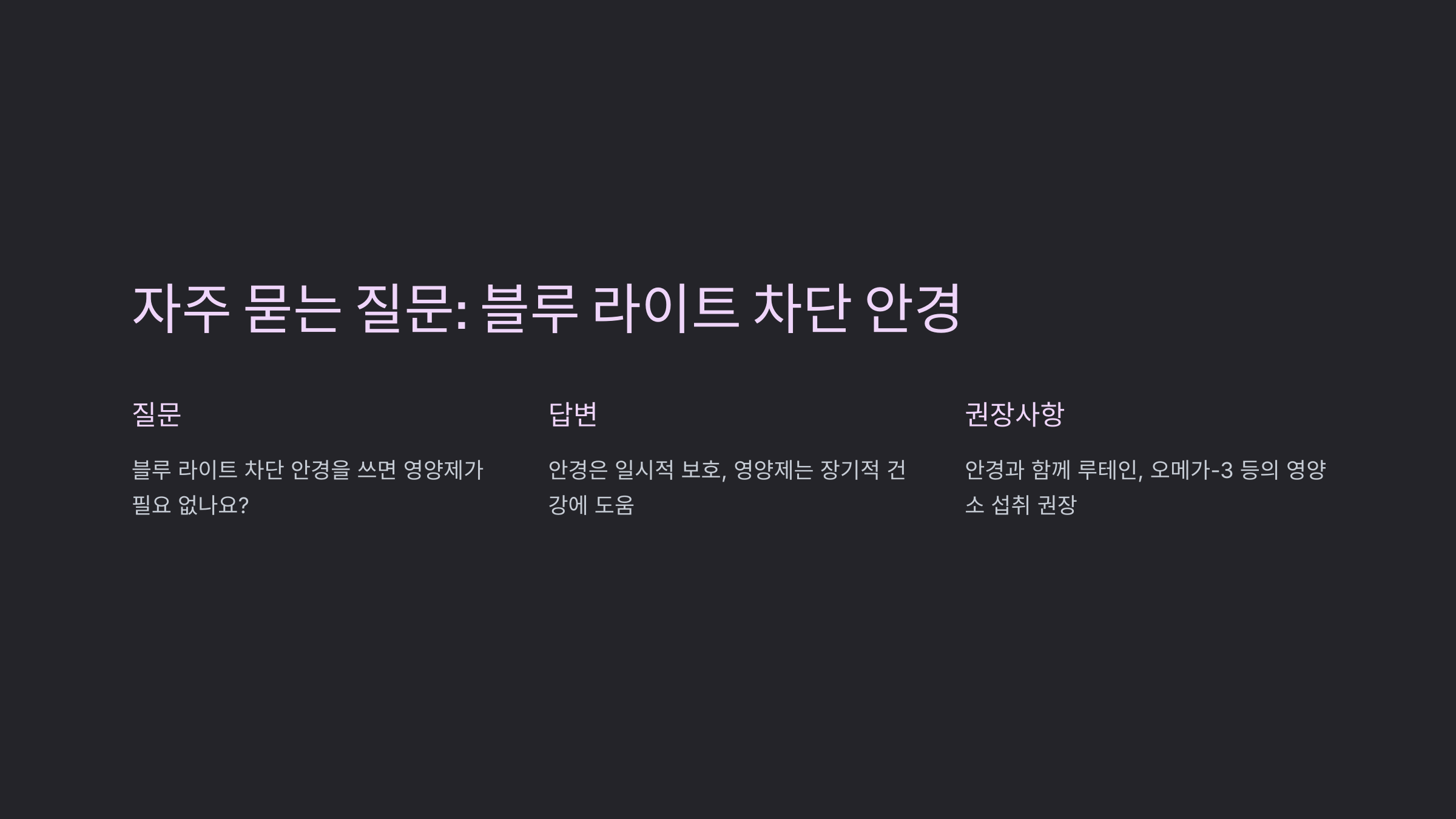 A2: 블루 라이트 차단 안경은 일시적으로 눈을 보호할 수 있지만, 장기적인 눈 건강을 위해서는 루테인이나 오메가-3 같은 영양소를 섭취하는 것이 좋습니다.