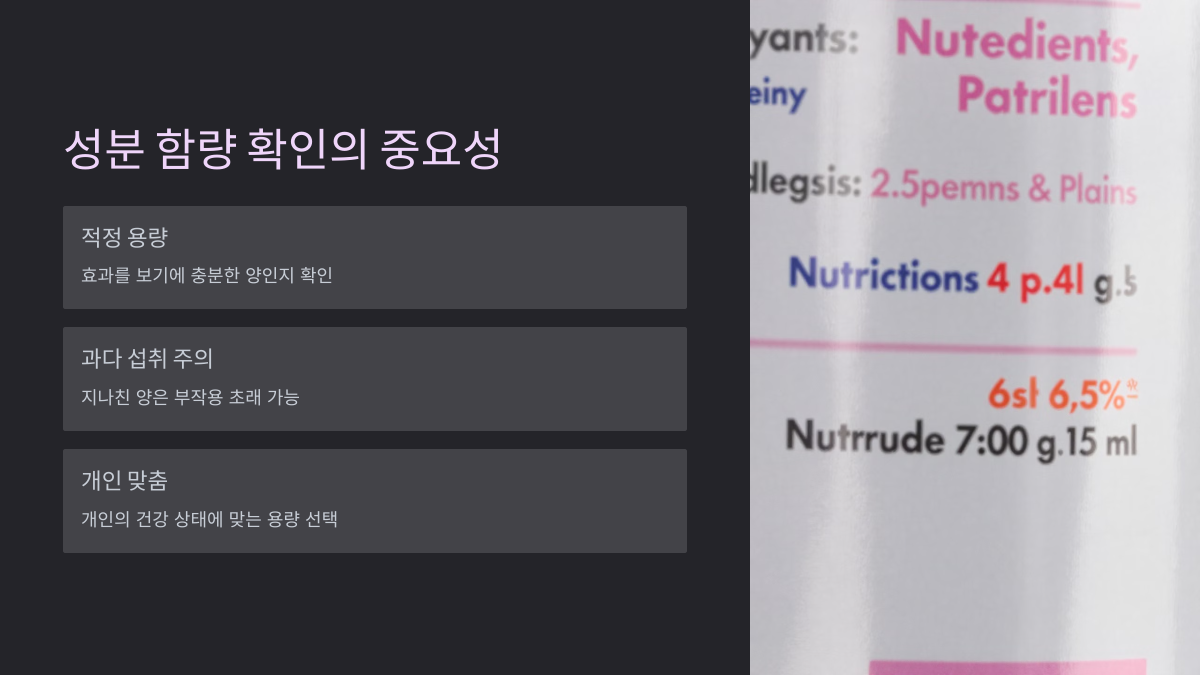 영양제를 선택할 때는 단순히 성분만 확인하는 것보다 다양한 요소를 고려해야 합니다. 특히 아래의 사항들을 신경 쓰는 것이 중요합니다.