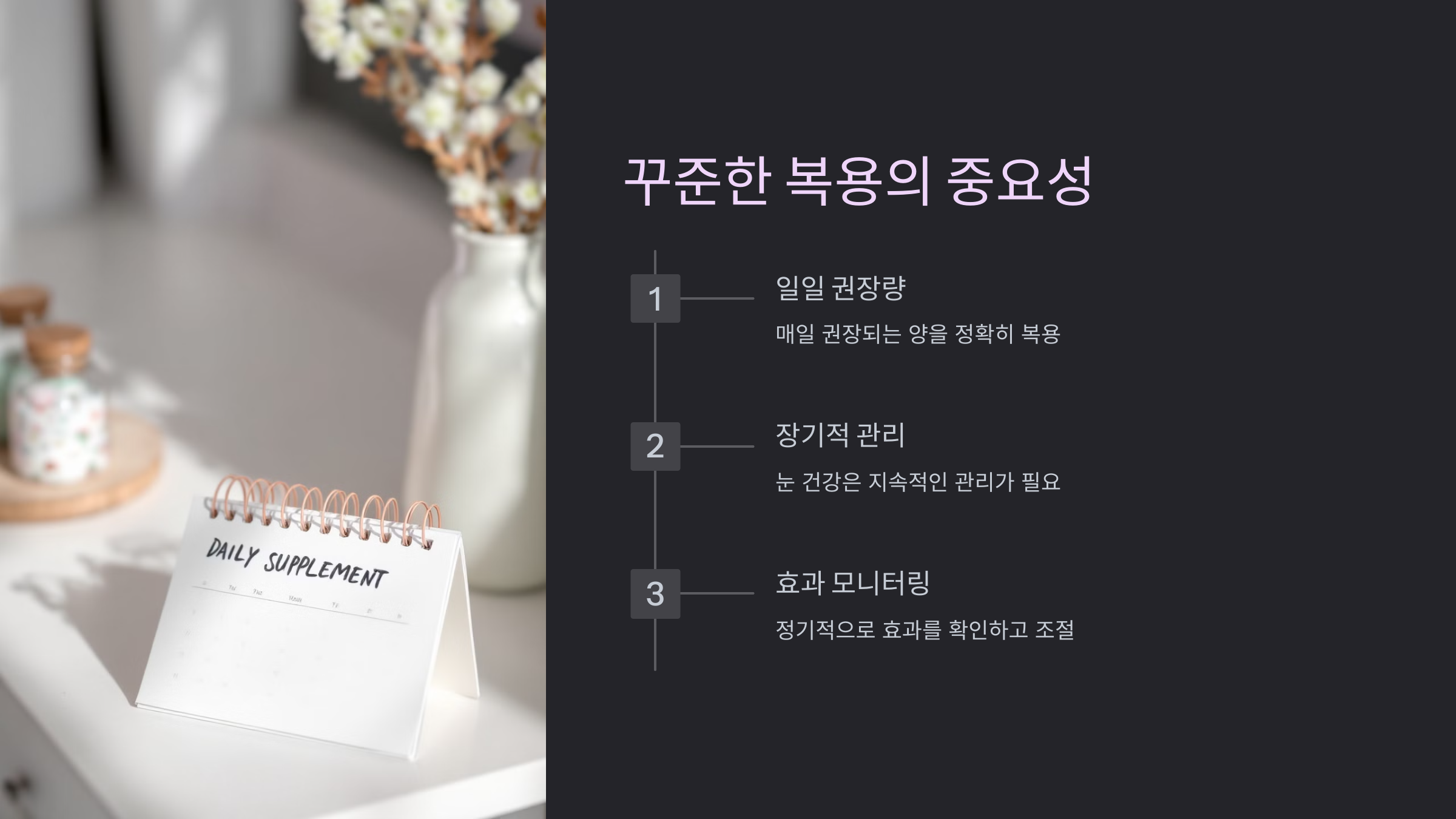 영양제는 꾸준히 복용해야 효과를 볼 수 있습니다. 하루 권장량에 맞춰 복용하며, 지나치게 과다 복용하지 않도록 주의해야 합니다. 특히 눈 건강은 장기적인 관리가 필요한 부분이므로 꾸준히 섭취하는 것이 중요합니다.