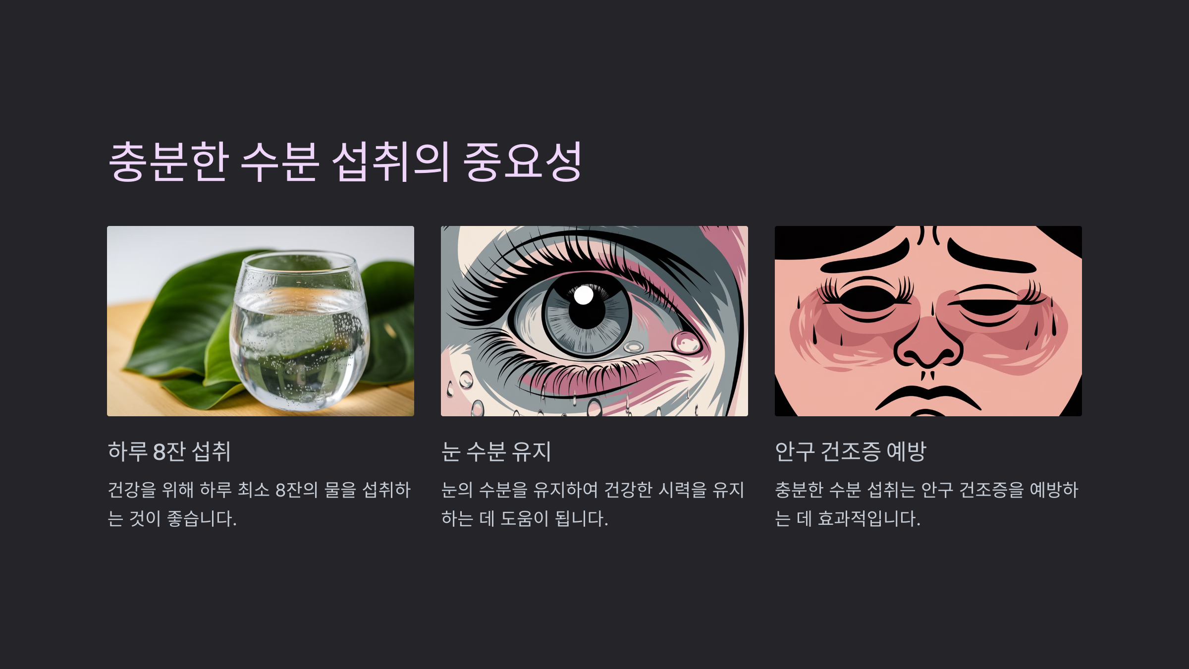 하루에 적어도 8잔 이상의 물을 마셔 눈의 수분을 유지하는 것이 중요합니다. 충분한 수분 섭취는 안구 건조증 예방에도 큰 도움이 됩니다.
