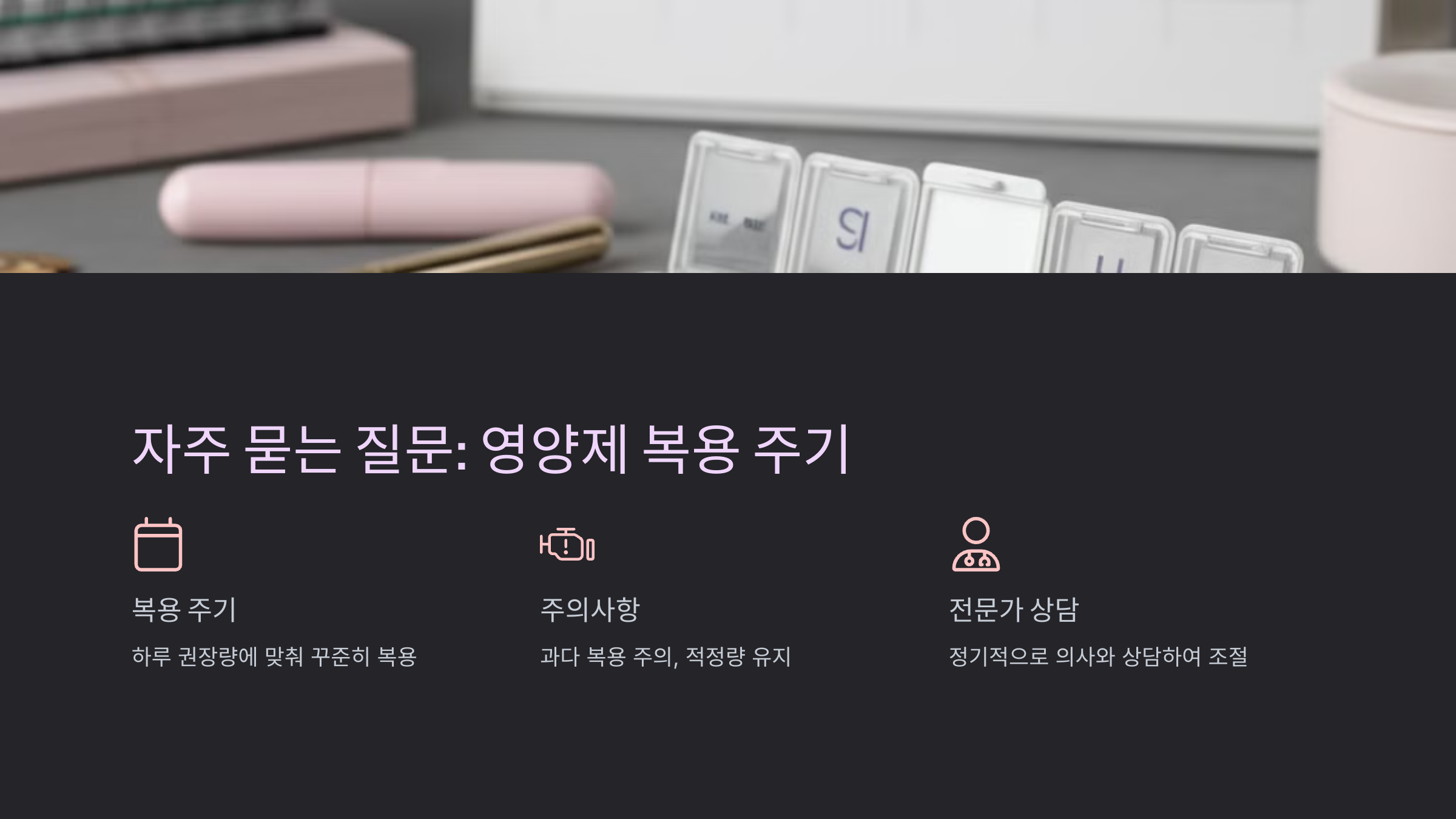 A3: 영양제는 하루 권장량에 맞춰 꾸준히 복용해야 합니다. 과다 복용하지 않도록 주의하고, 정기적으로 의사와 상담하는 것이 좋습니다.