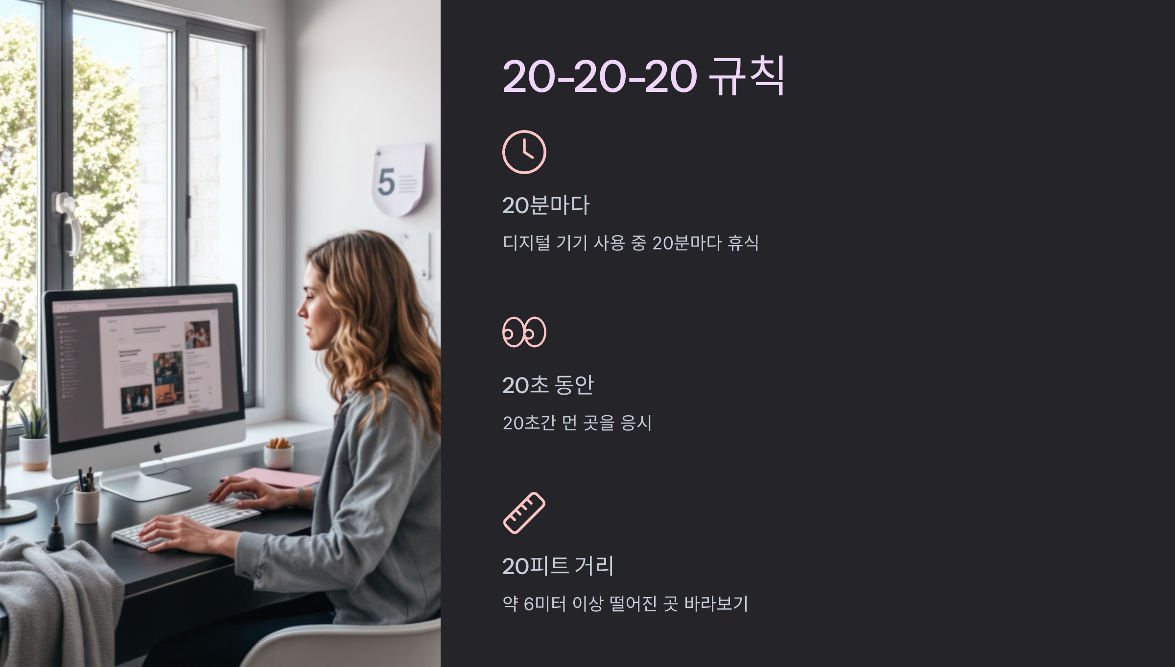 디지털 기기를 사용할 때는 20-20-20 규칙을 지켜야 합니다. 20분마다 20초 동안 20피트(약 6미터) 이상 떨어진 곳을 바라보는 습관을 들이면 눈의 피로를 줄일 수 있습니다.