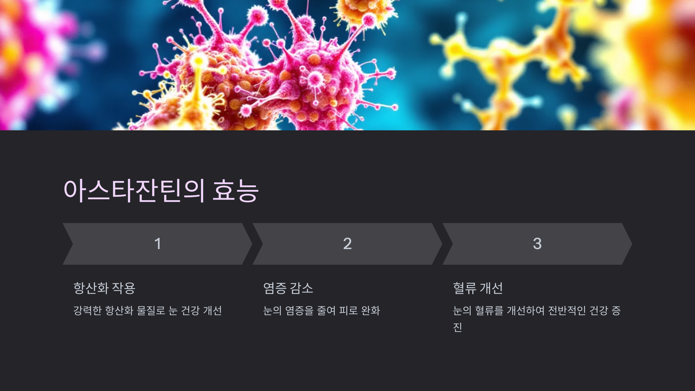 아스타잔틴은 강력한 항산화 물질로, 눈의 염증과 피로를 줄여주는 효과가 있습니다. 특히 디지털 기기를 자주 사용하는 사람들에게 좋은 영양소로, 눈의 피로를 줄이고 혈류를 개선해 눈 건강을 전반적으로 개선할 수 있습니다.