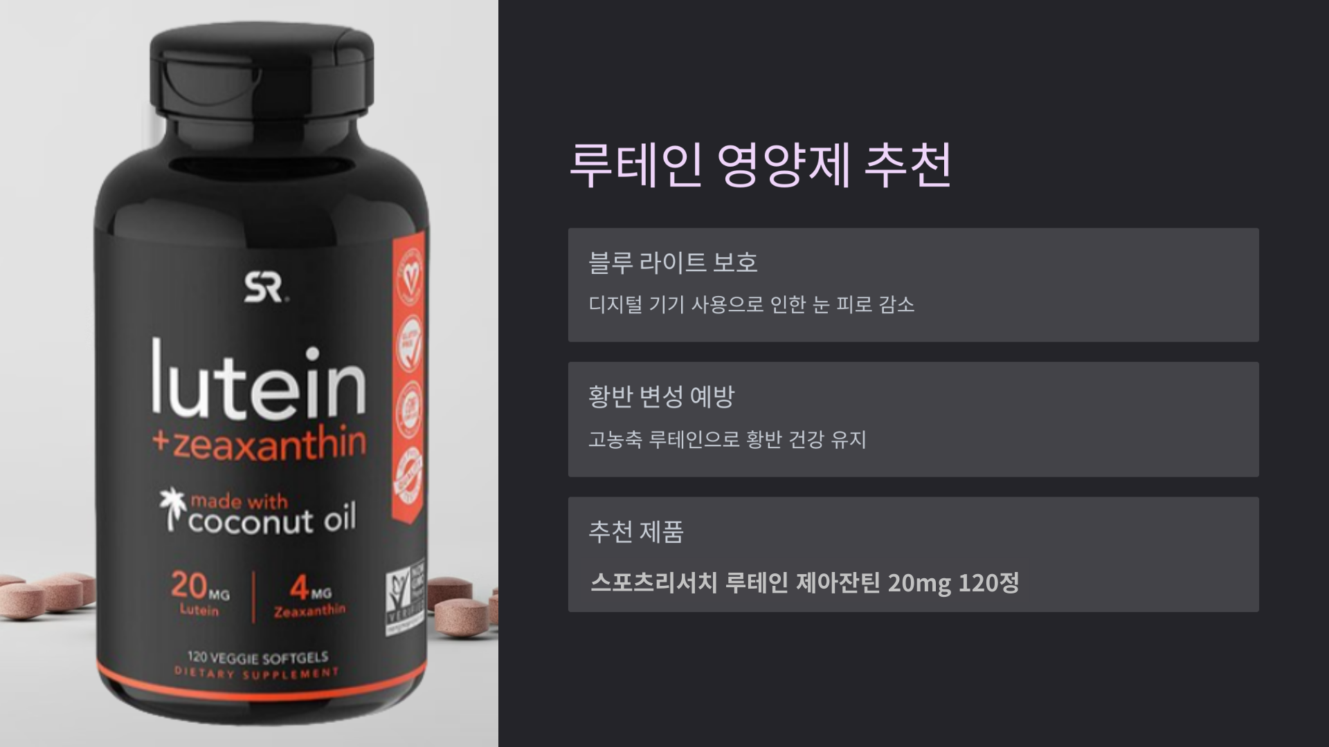 루테인은 블루 라이트로부터 눈을 보호하고, 장시간 디지털 기기 사용으로 인한 눈의 피로를 줄이는 데 효과적입니다. 많은 루테인 제품이 시중에 나와 있으며, 특히 황반 변성을 예방하는 데 도움이 되는 고농축 루테인 제품들이 인기입니다.