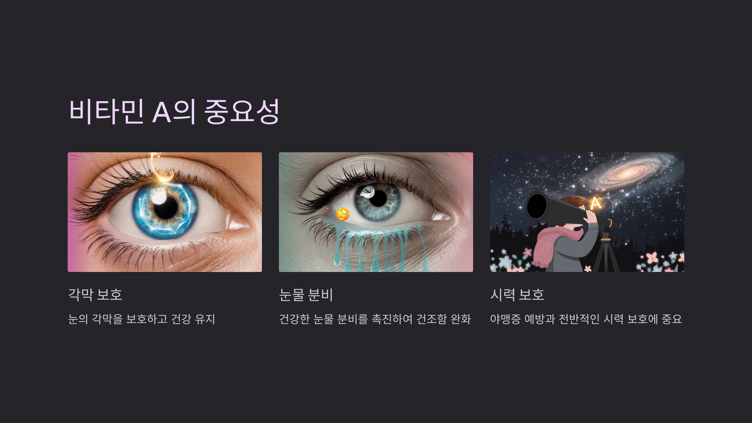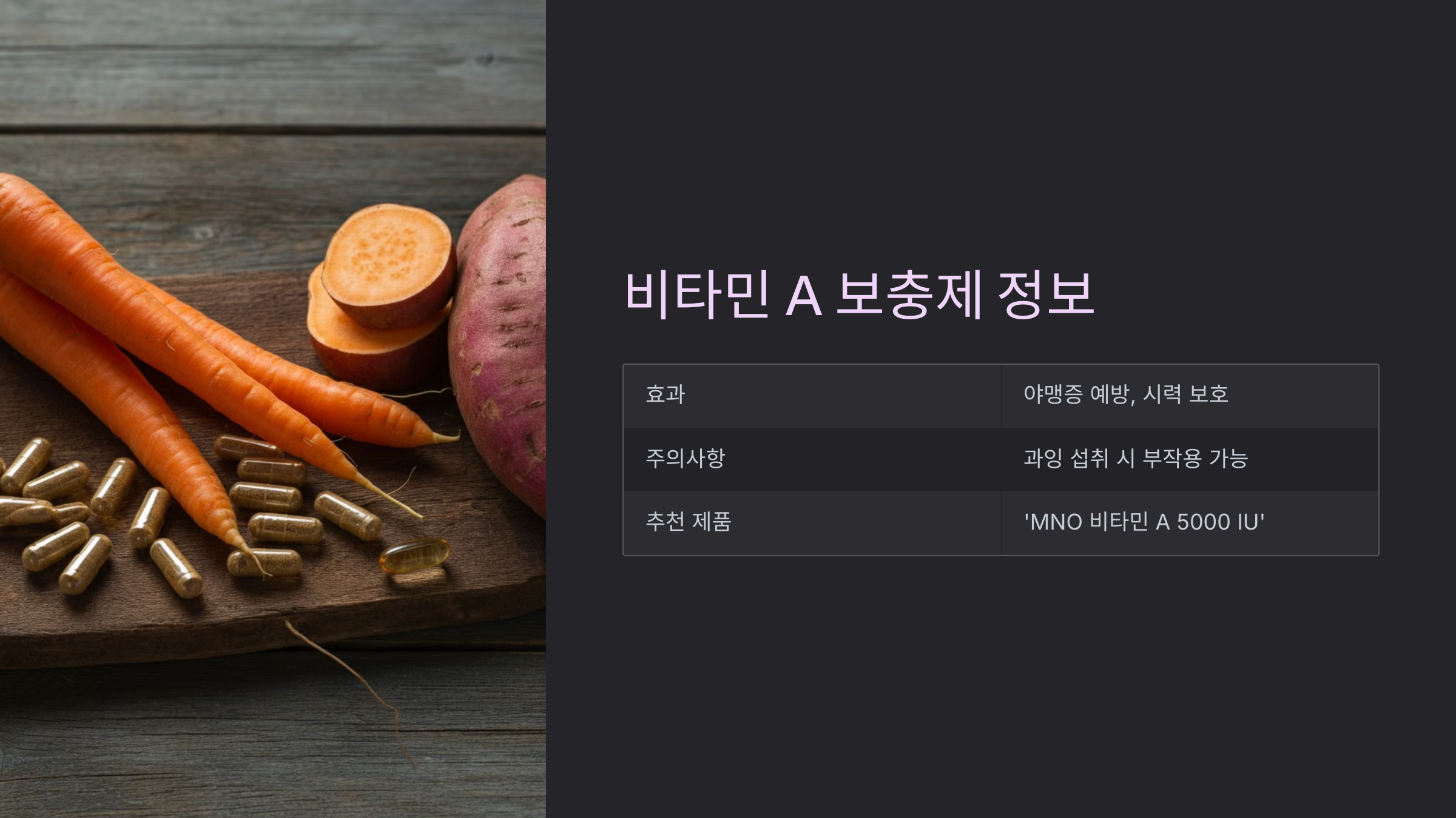 비타민 A는 눈의 피로와 야맹증을 예방하는 데 매우 중요한 역할을 하며, 특히 시력을 보호하고 눈의 점막을 건강하게 유지합니다. 비타민 A는 과잉 섭취 시 부작용이 있을 수 있으므로 적절한 용량을 섭취하는 것이 중요합니다.