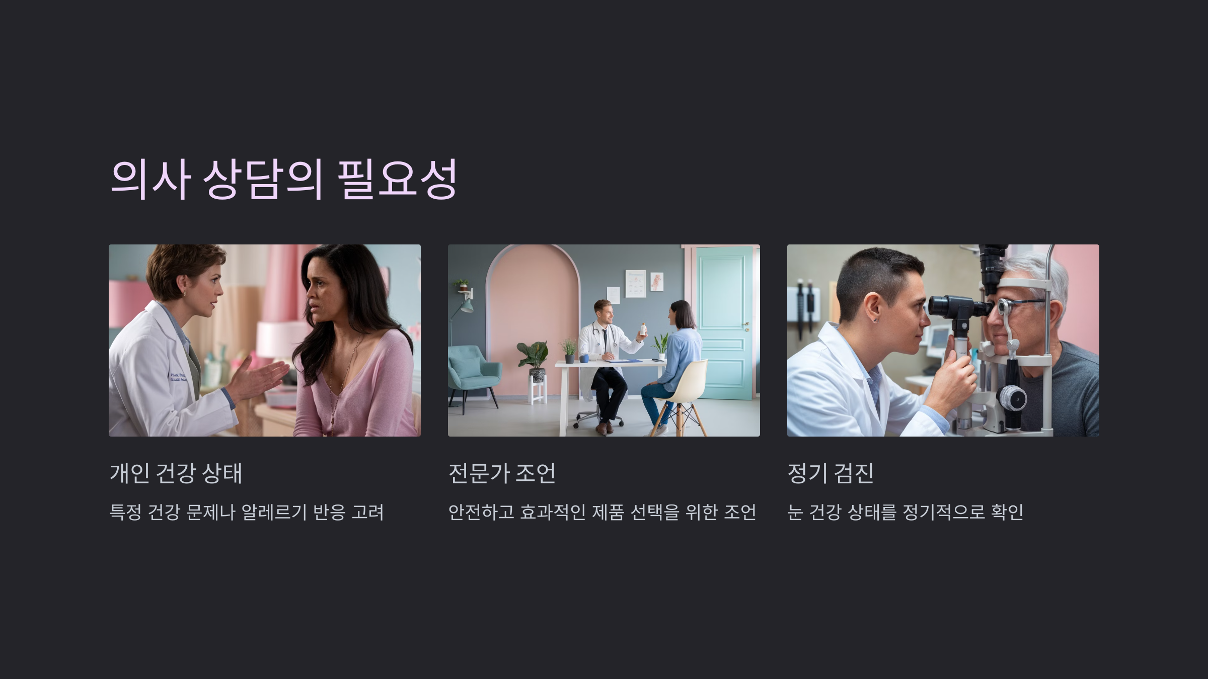 특정 건강 상태나 알레르기 반응이 있는 경우, 영양제를 복용하기 전에 의사와 상담하는 것이 좋습니다. 개인에게 맞는 제품을 선택하기 위해 전문가의 조언을 따르는 것이 안전합니다.