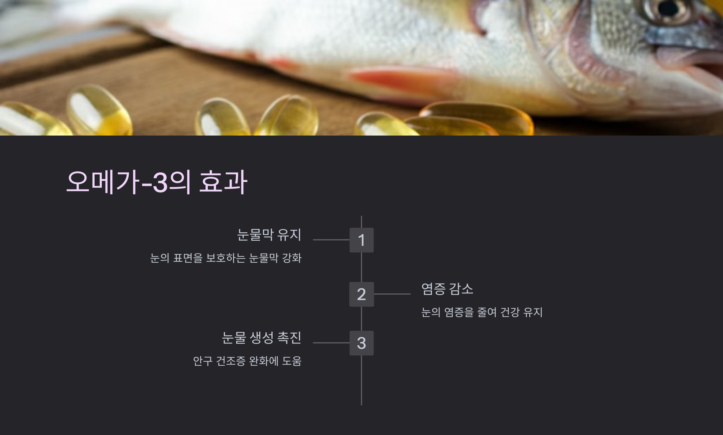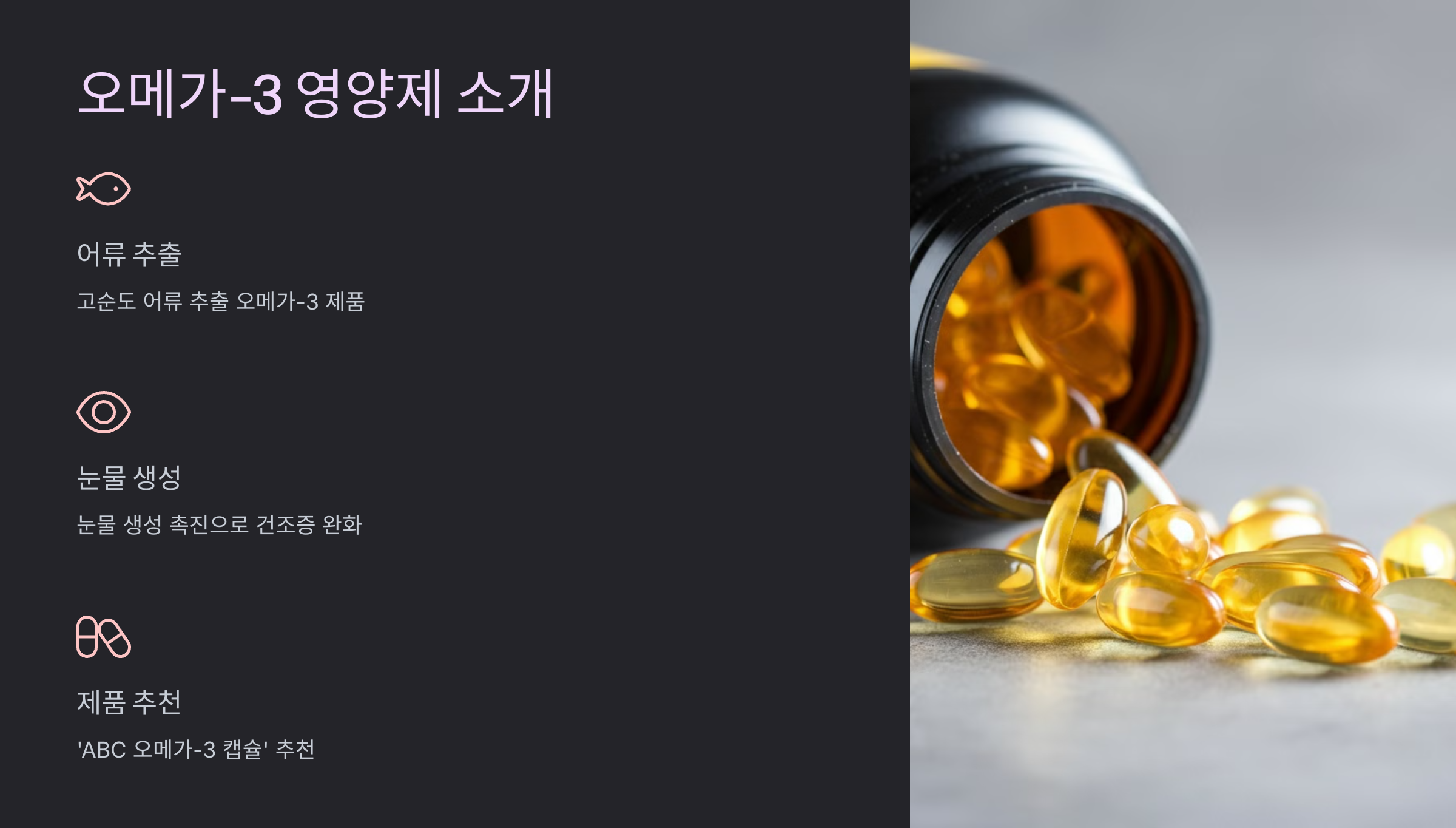 안구 건조증 완화에 탁월한 효과가 있는 오메가-3 지방산은 눈물 생성과 눈 건강에 중요한 역할을 합니다. 특히 어류에서 추출한 고순도 오메가-3는 눈 건조증을 겪는 사람들이 많이 찾는 제품입니다.