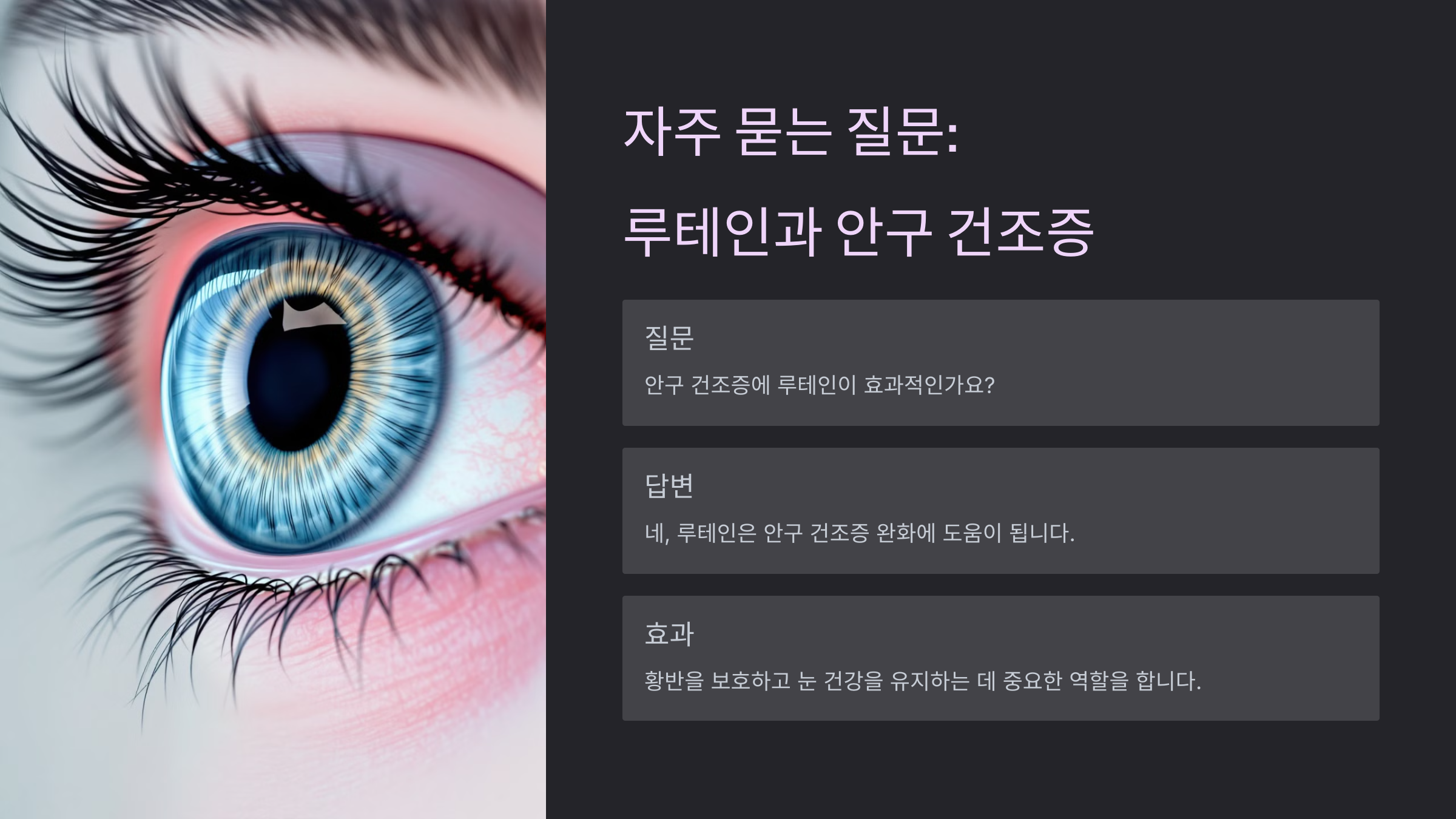 A1: 네, 루테인은 안구 건조증 완화에 도움이 됩니다. 황반을 보호하고 눈 건강을 유지하는 데 중요한 역할을 합니다.