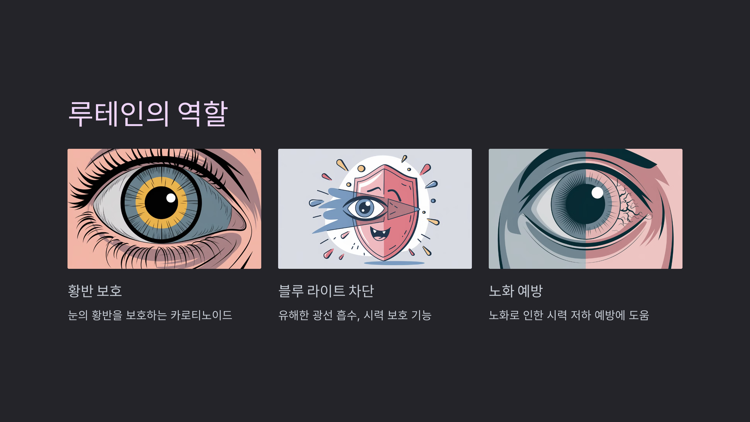 루테인은 눈의 황반을 보호하는 역할을 하는 카로티노이드의 일종으로, 특히 블루 라이트에 의한 손상을 줄이는 데 도움이 됩니다. 눈에 들어오는 유해한 광선을 흡수하고, 시력 보호에 중요한 역할을 하여 노화로 인한 시력 저하를 예방할 수 있습니다. 루테인은 특히 디지털 기기를 많이 사용하는 사람들에게 필수적인 성분입니다.