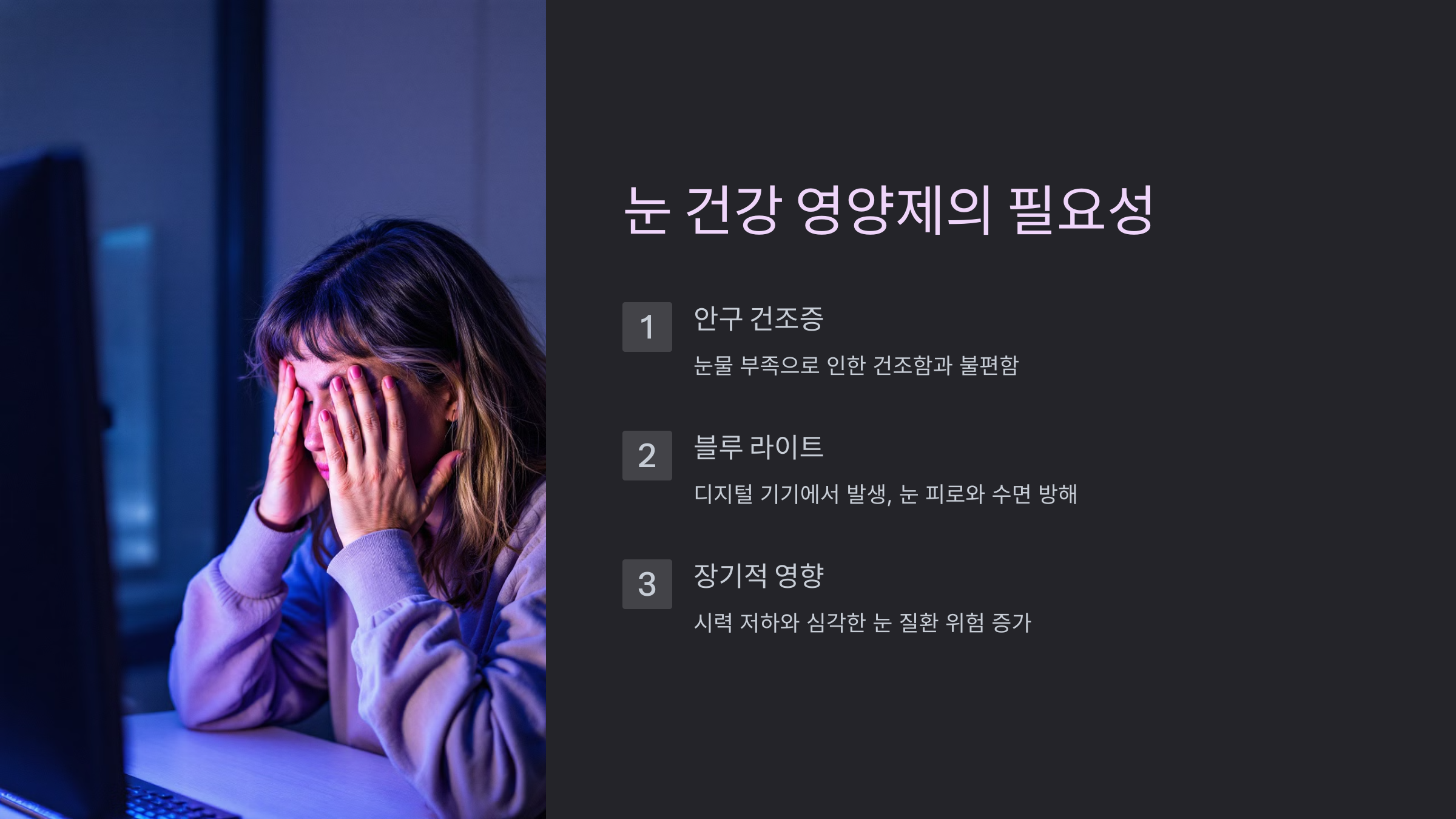 안구 건조증은 눈이 충분한 눈물을 만들지 못하거나 눈물이 너무 빨리 증발할 때 발생하는 상태로, 눈이 건조해지고 뻑뻑한 느낌을 주게 됩니다. 블루 라이트는 스마트폰, 컴퓨터 모니터, 텔레비전 등 디지털 기기에서 나오는 청색광으로, 눈에 피로를 더해줄 뿐만 아니라 수면에도 영향을 미칩니다. 장기적으로 이러한 문제들은 시력 저하와 더 심각한 눈 질환으로 이어질 수 있습니다.