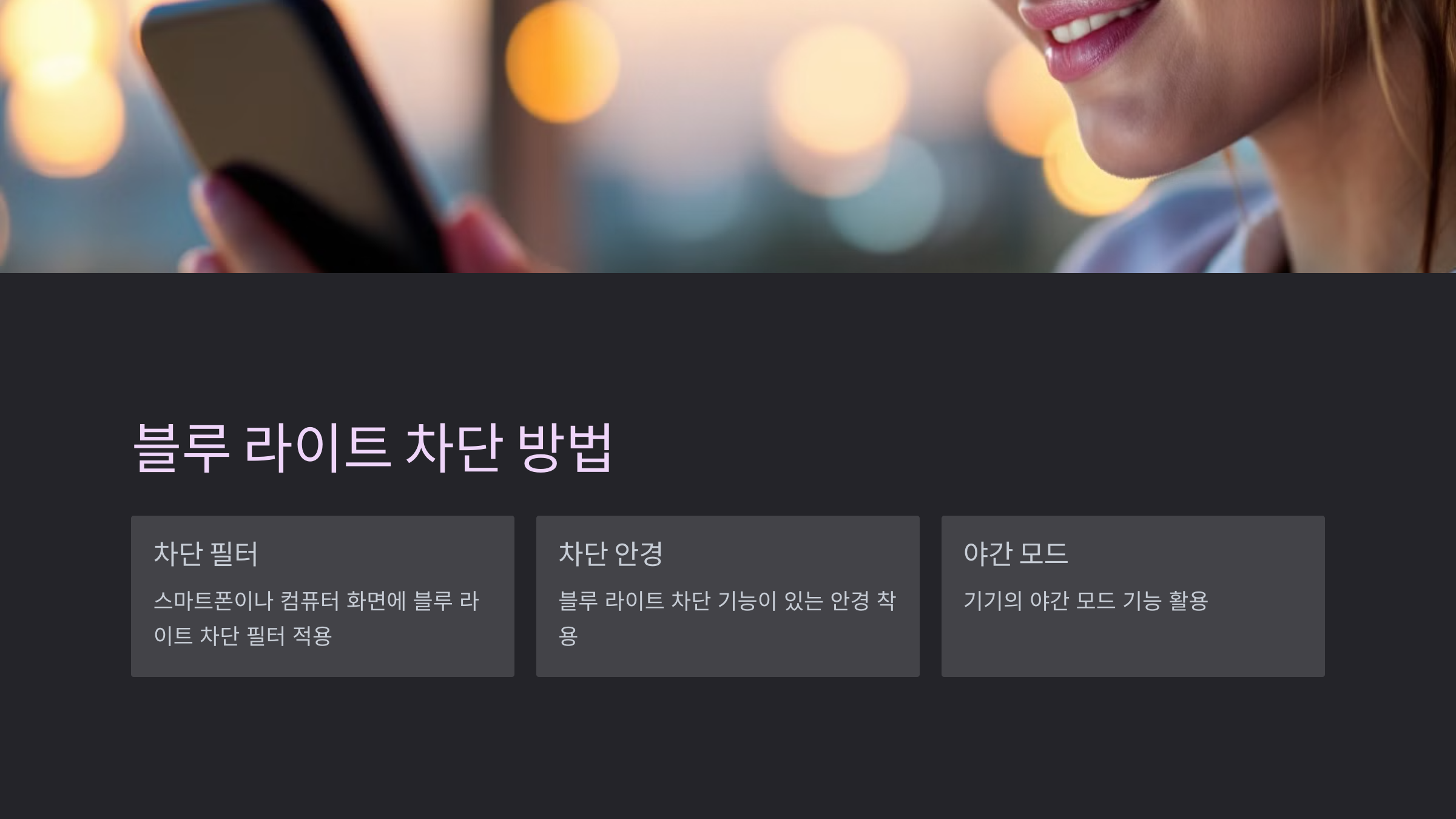 스마트폰이나 컴퓨터 화면에서 나오는 블루 라이트는 눈에 큰 부담을 줍니다. 블루 라이트 필터를 사용하거나 차단 안경을 착용하여 눈을 보호할 수 있습니다.
