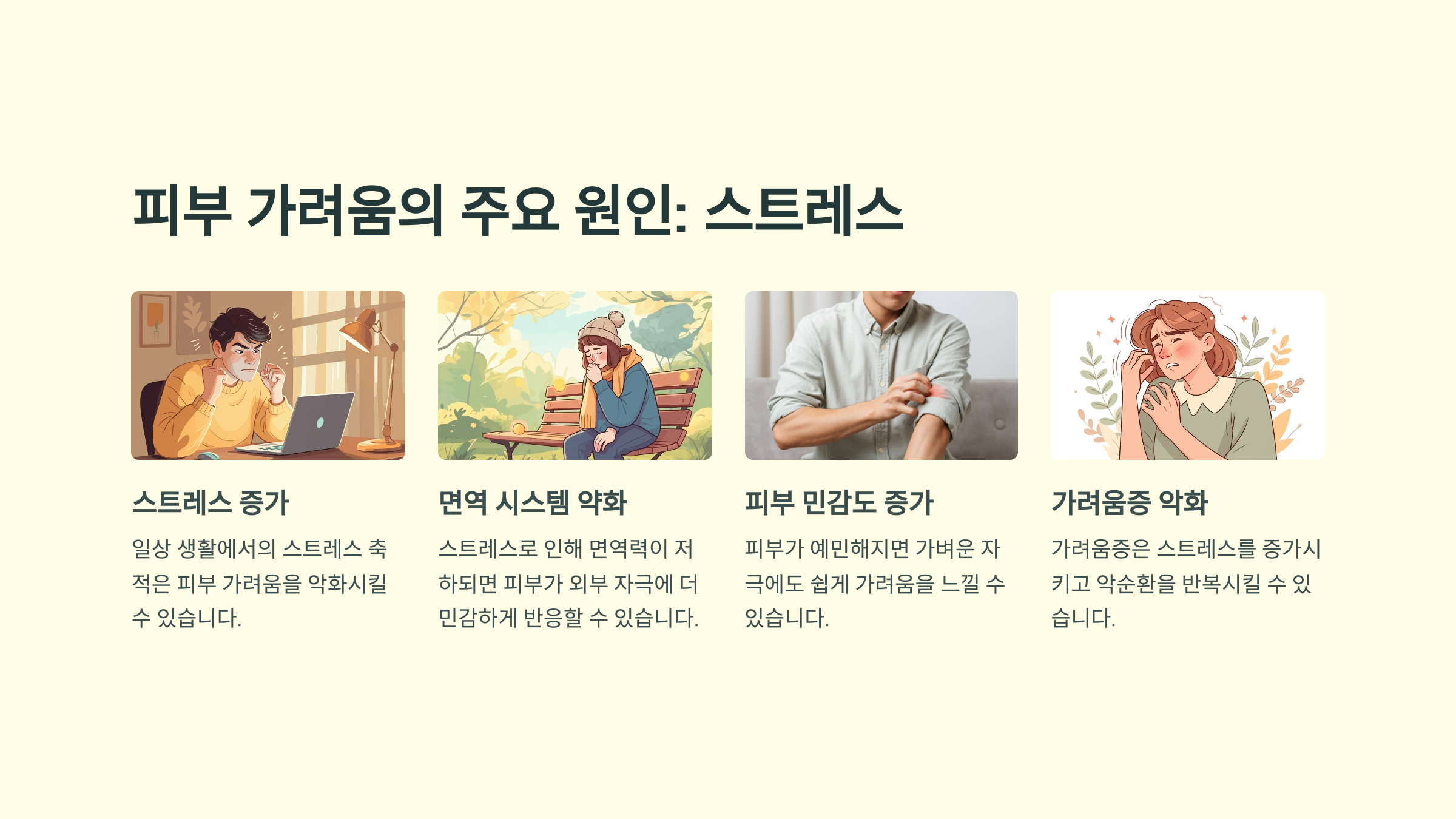 또한 스트레스도 피부 가려움의 중요한 원인 중 하나입니다. 신체는 정신적 스트레스를 받으면 면역 시스템이 약해지고, 그로 인해 피부가 더 예민해지기 때문에 가려움증이 심해질 수 있습니다.