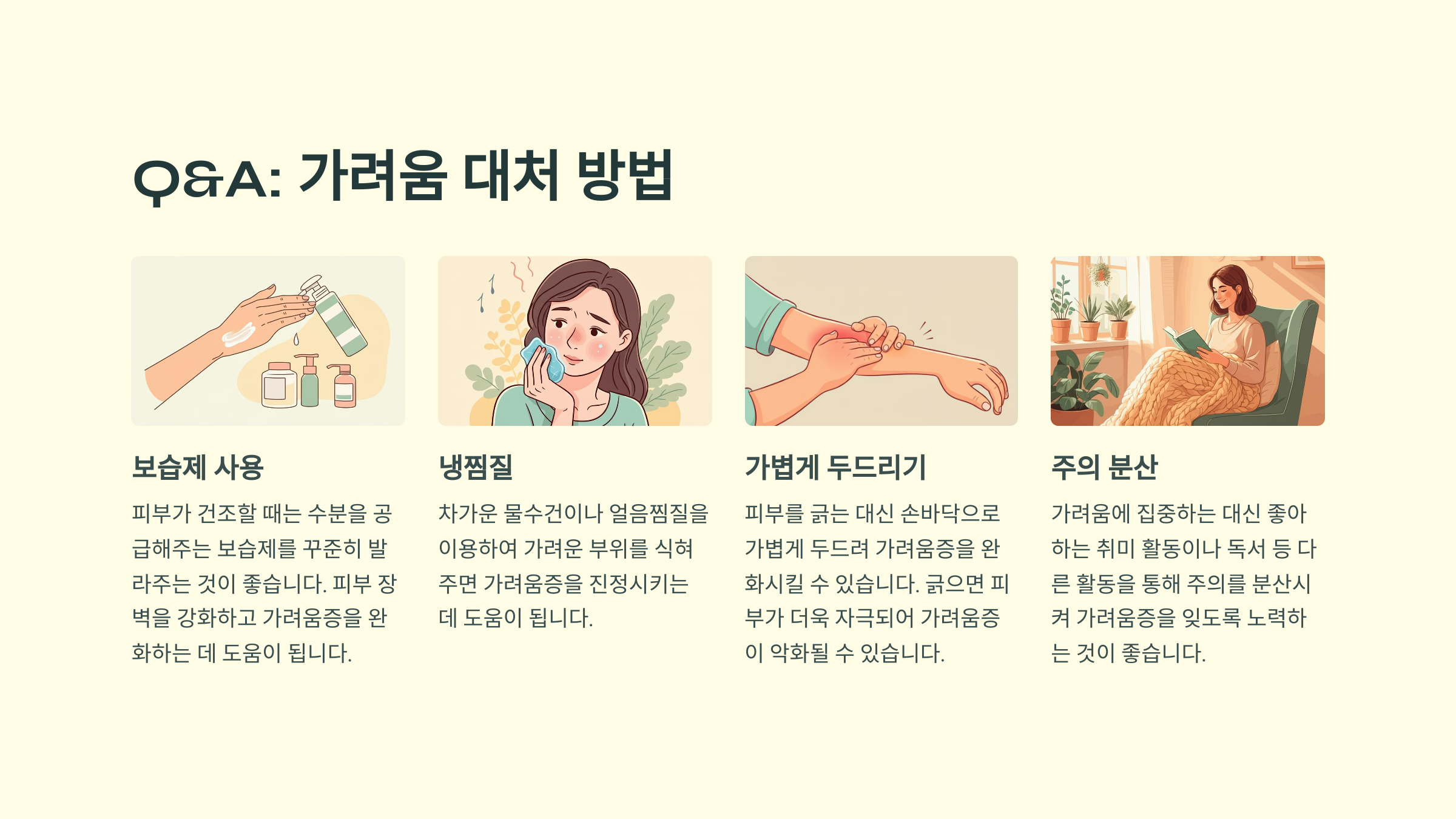 A: 긁지 않고 보습제를 발라주는 것이 중요합니다. 차가운 물수건으로 피부를 진정시키는 냉찜질도 도움이 됩니다.