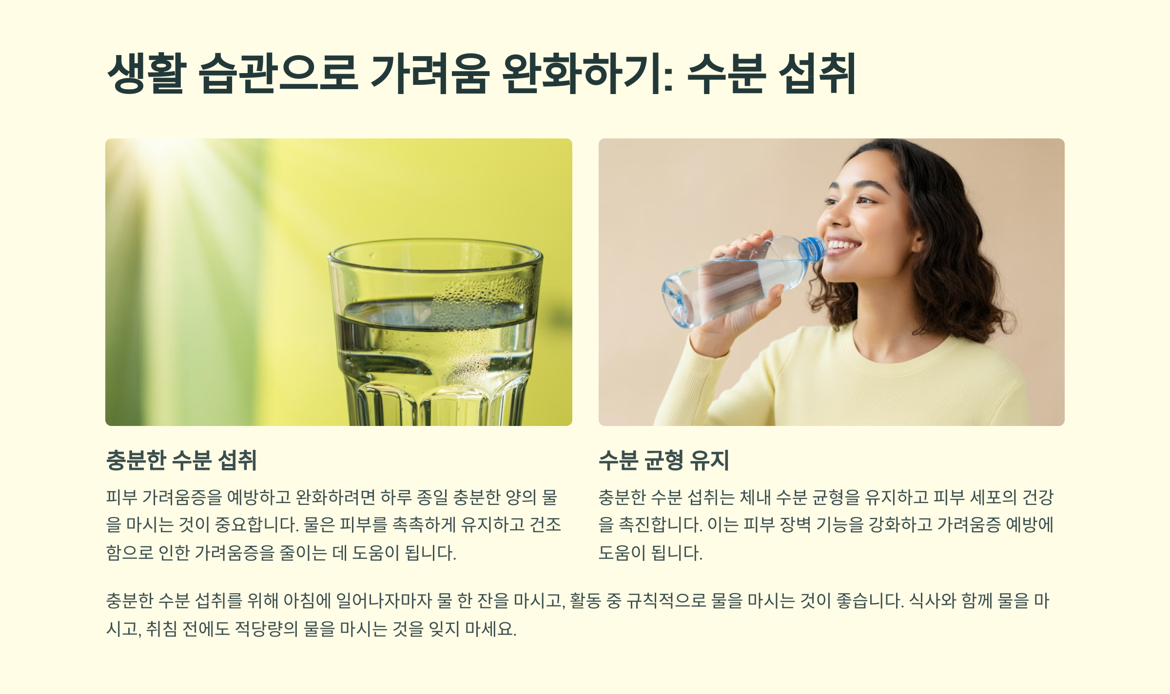 피부 가려움증을 예방하고 완화하려면 생활 습관도 중요합니다. 첫 번째로 충분한 수분 섭취가 필수입니다. 하루에 충분한 양의 물을 마시면 피부가 건조해지는 것을 방지할 수 있습니다.