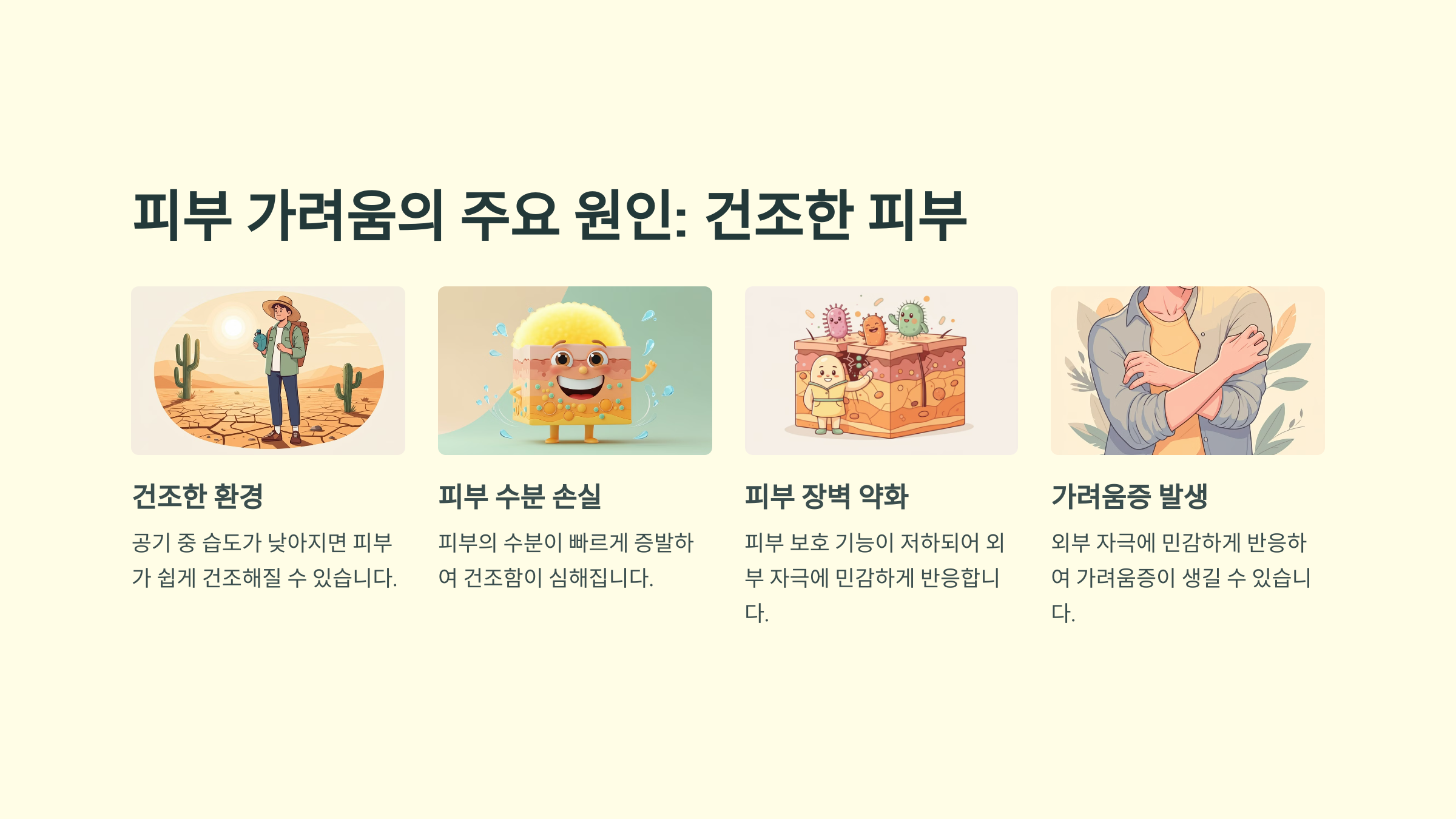 피부 가려움의 원인은 매우 다양합니다. 그중 가장 흔한 원인은 건조한 피부입니다. 특히 환절기나 겨울철처럼 공기가 건조한 시기에는 피부가 쉽게 건조해지며, 이로 인해 피부가 갈라지거나 보호 장벽이 약해질 수 있습니다. 피부 장벽이 약해지면 외부 자극에 더 민감해지며 가려움증이 생기기 쉽습니다.