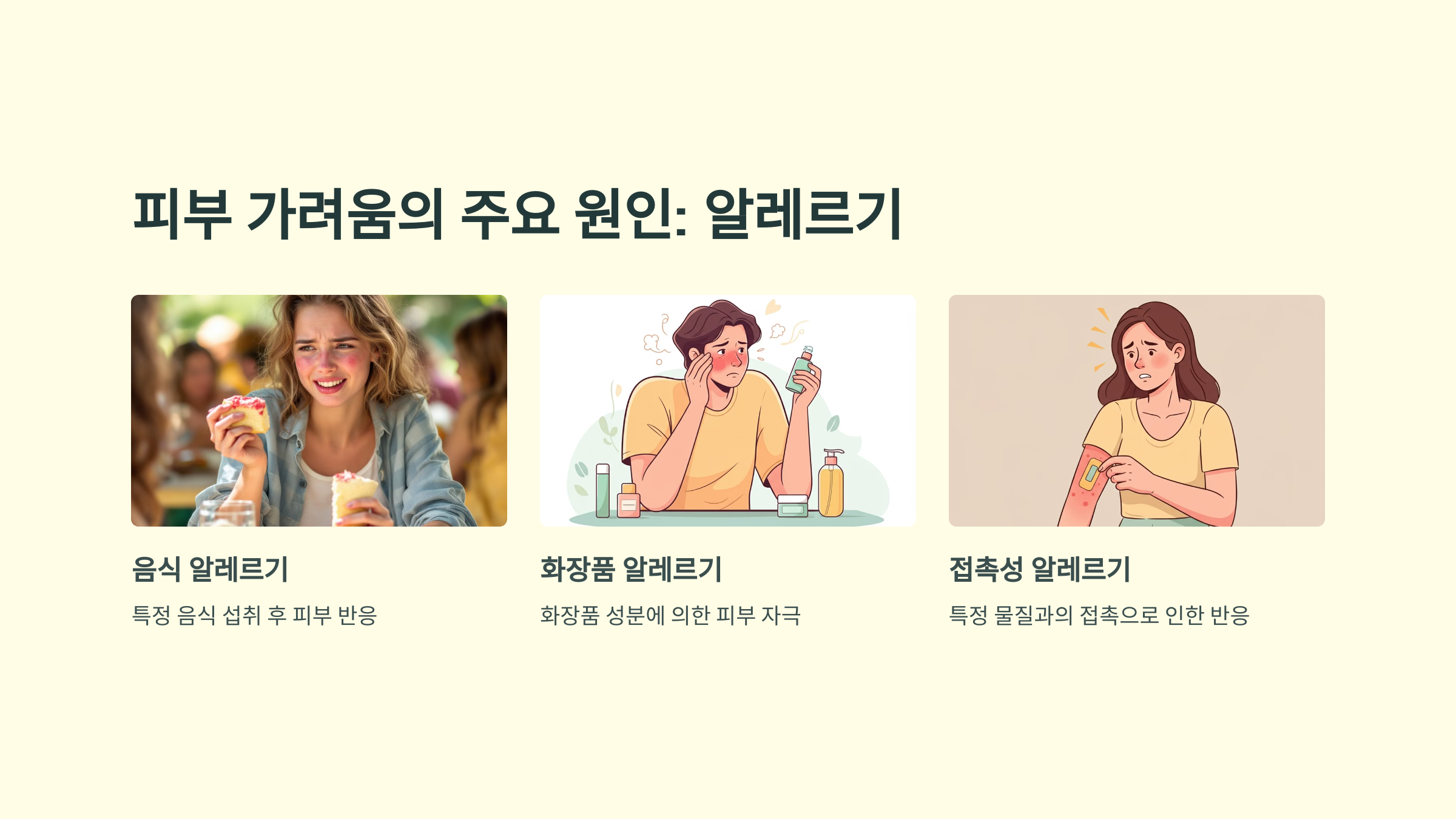 다음으로 자주 언급되는 원인은 알레르기입니다. 특정 음식, 화장품, 세정제 등에 포함된 화학 성분이 피부에 자극을 주어 알레르기 반응을 일으킬 수 있으며, 그 결과 피부가 붉어지거나 가려움이 발생할 수 있습니다. 알레르기성 피부염 같은 질환은 가려움증을 장기적으로 유발하는 원인이 될 수 있습니다.