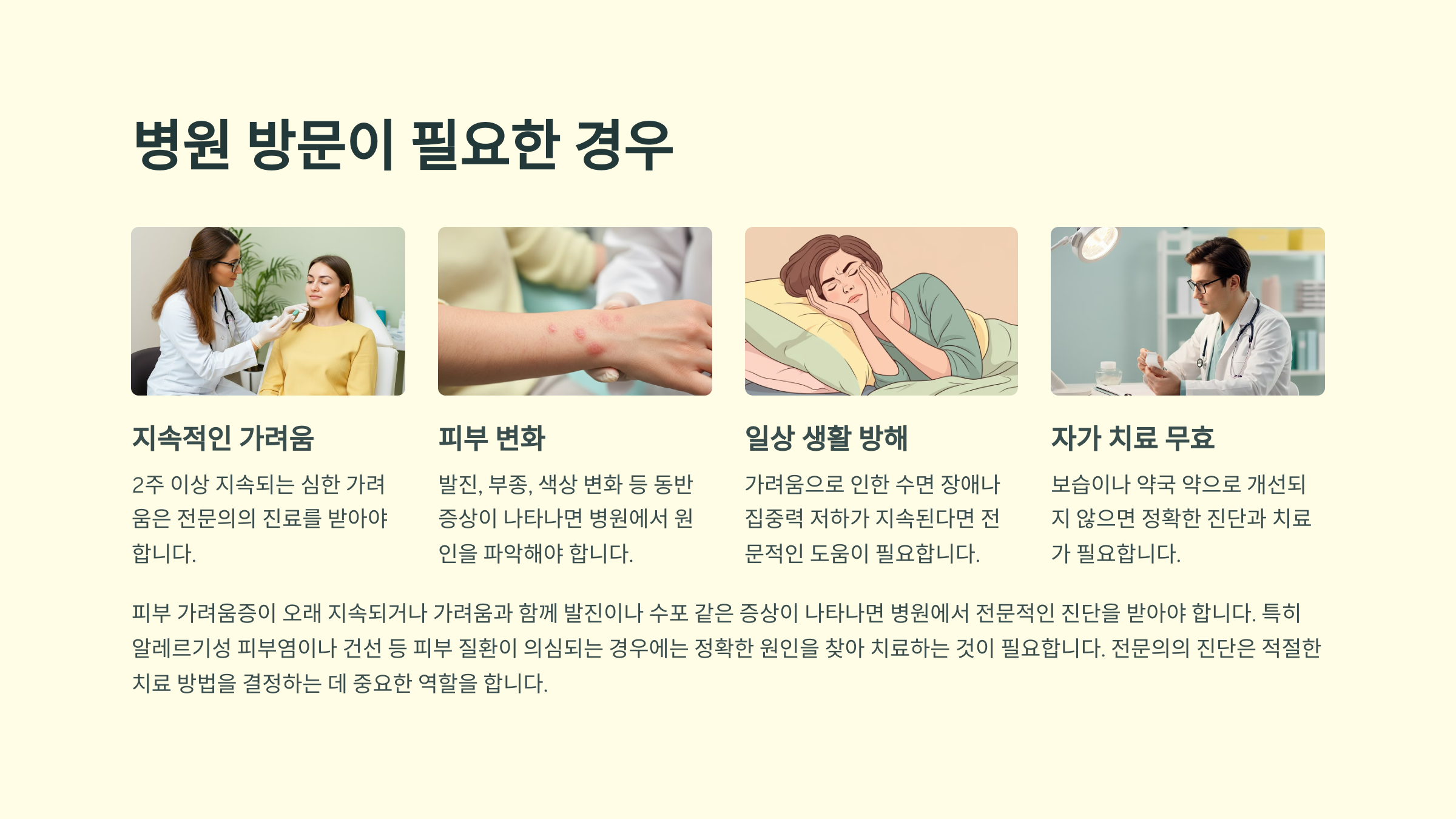 피부 가려움증이 오래 지속되거나 가려움과 함께 발진이나 수포 같은 증상이 나타나면 병원에서 전문적인 진단을 받아야 합니다. 특히 알레르기성 피부염이나 건선 등 피부 질환이 의심되는 경우에는 정확한 원인을 찾아 치료하는 것이 필요합니다.