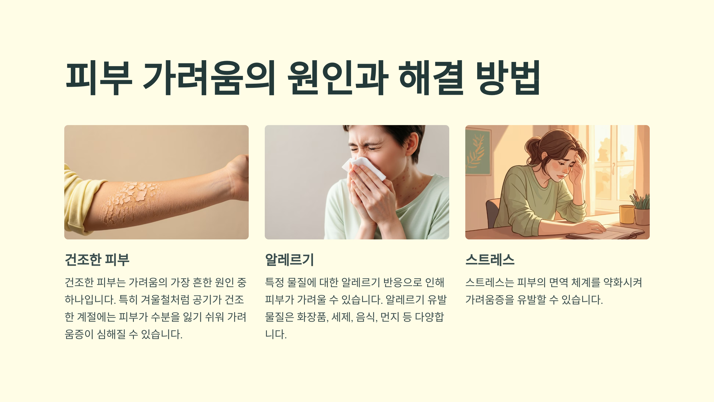 A: 피부가 건조하거나 알레르기 반응, 스트레스 등으로 인해 발생할 수 있습니다. 특히 피부 장벽이 약해지면 외부 자극에 더 민감하게 반응하여 가려움증이 유발됩니다.