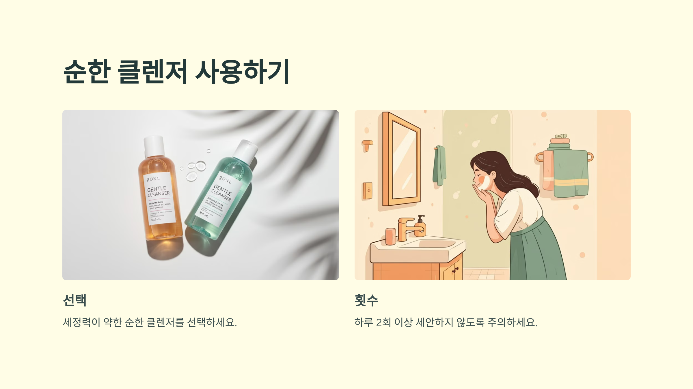 피부 장벽을 보호하려면 순한 클렌저를 사용하는 것이 중요합니다. 피부의 천연 오일을 과도하게 제거하지 않는 세정력이 약한 제품을 선택하세요. 또한, 하루에 2회 이상 세안하는 것도 피부 장벽에 부담이 될 수 있으니, 적당한 세안 횟수를 유지하는 것이 좋습니다.
