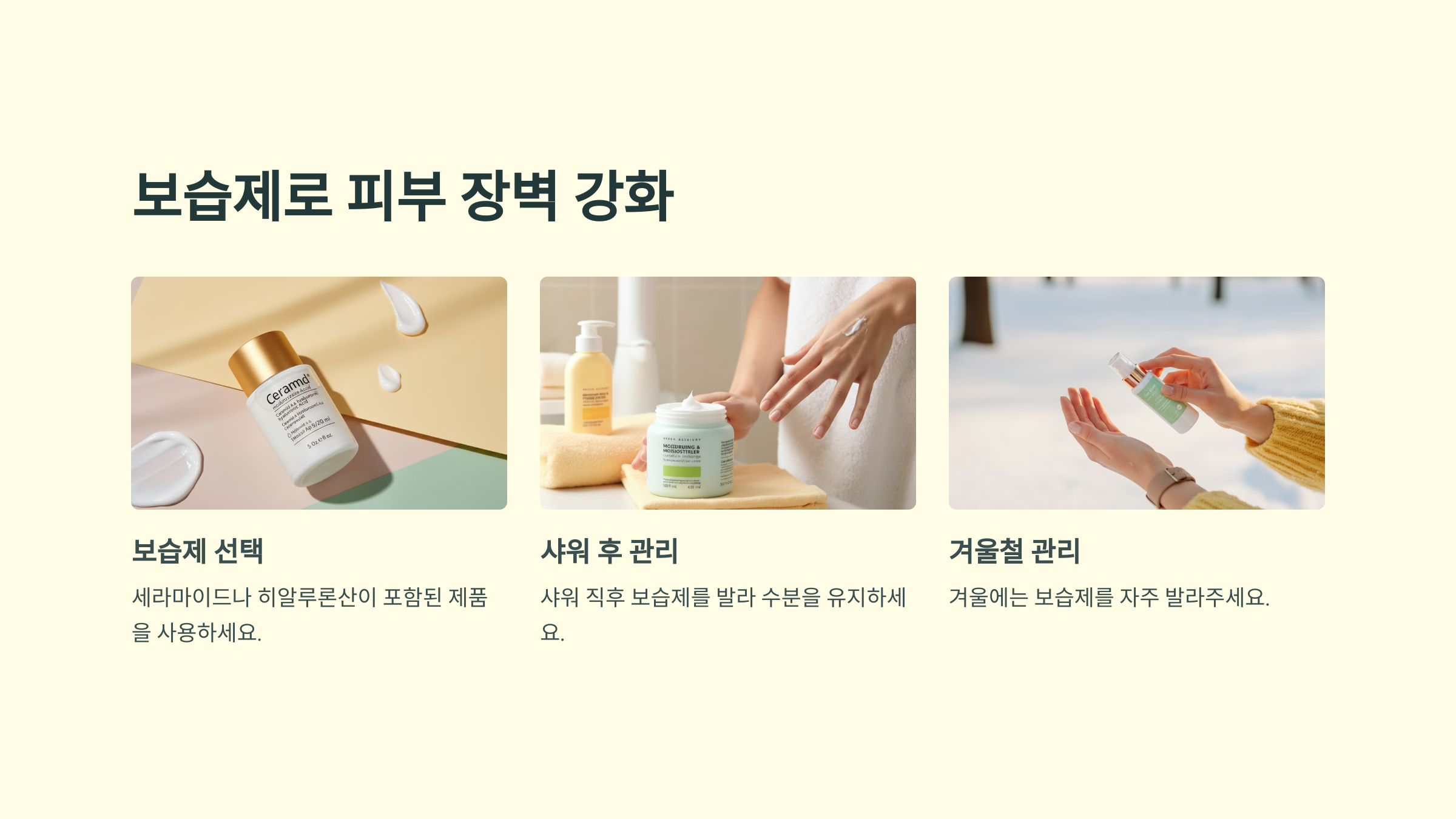 샤워 후에는 피부가 수분을 잃기 전에 바로 보습제를 발라주는 것이 효과적입니다. 특히 겨울철에는 보습제를 하루에 여러 번 발라 피부를 촉촉하게 유지하는 것이 중요합니다.