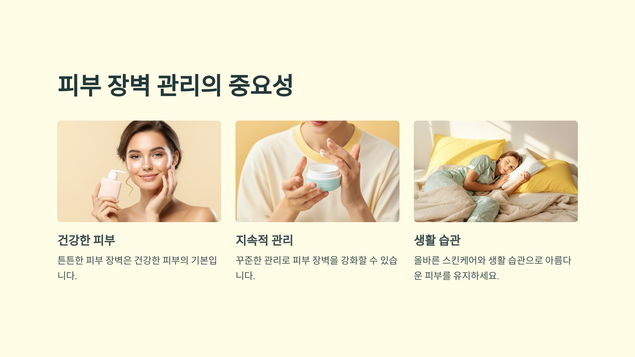 피부 장벽은 건강한 피부의 기본입니다. 이를 튼튼하게 유지하려면 적절한 스킨케어와 생활 습관이 필수적입니다. 손상된 피부 장벽은 시간이 지나면 회복될 수 있지만, 그 과정에서 피부에 자극을 주지 않는 것이 중요합니다. 피부가 건조하고 민감하다면, 피부 장벽을 강화하는 제품을 사용하고 충분한 보습을 유지하는 습관을 기르는 것이 필요합니다. 작은 변화로 건강한 피부를 만들 수 있습니다.