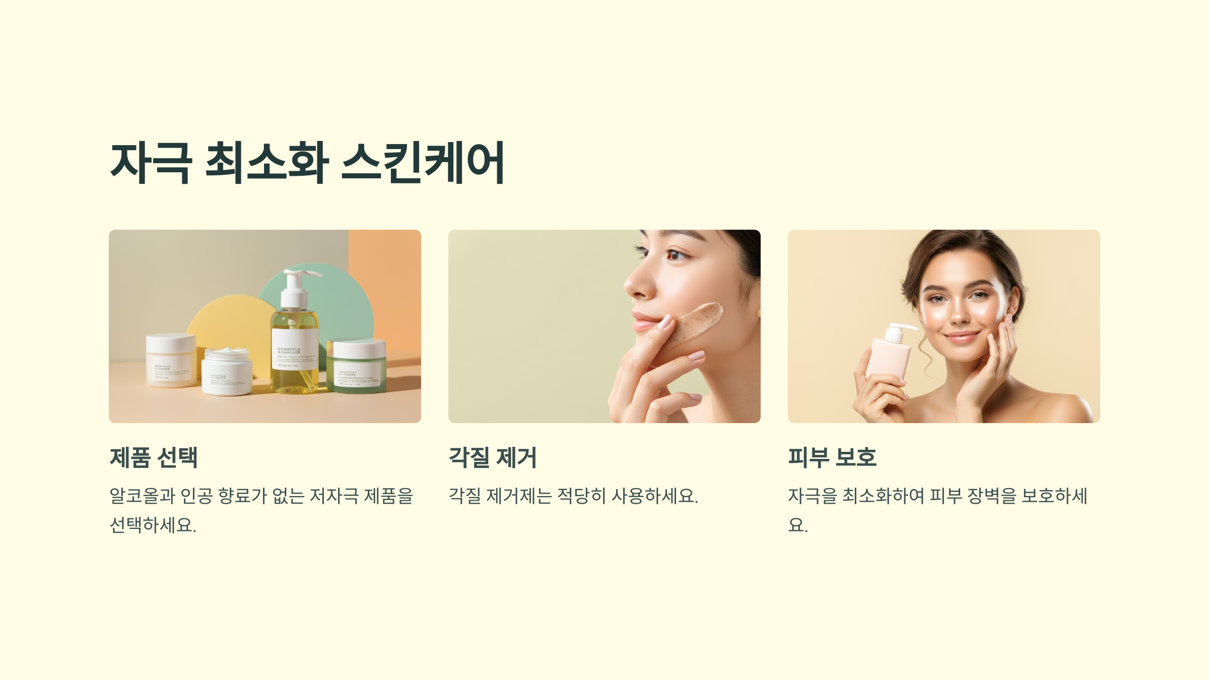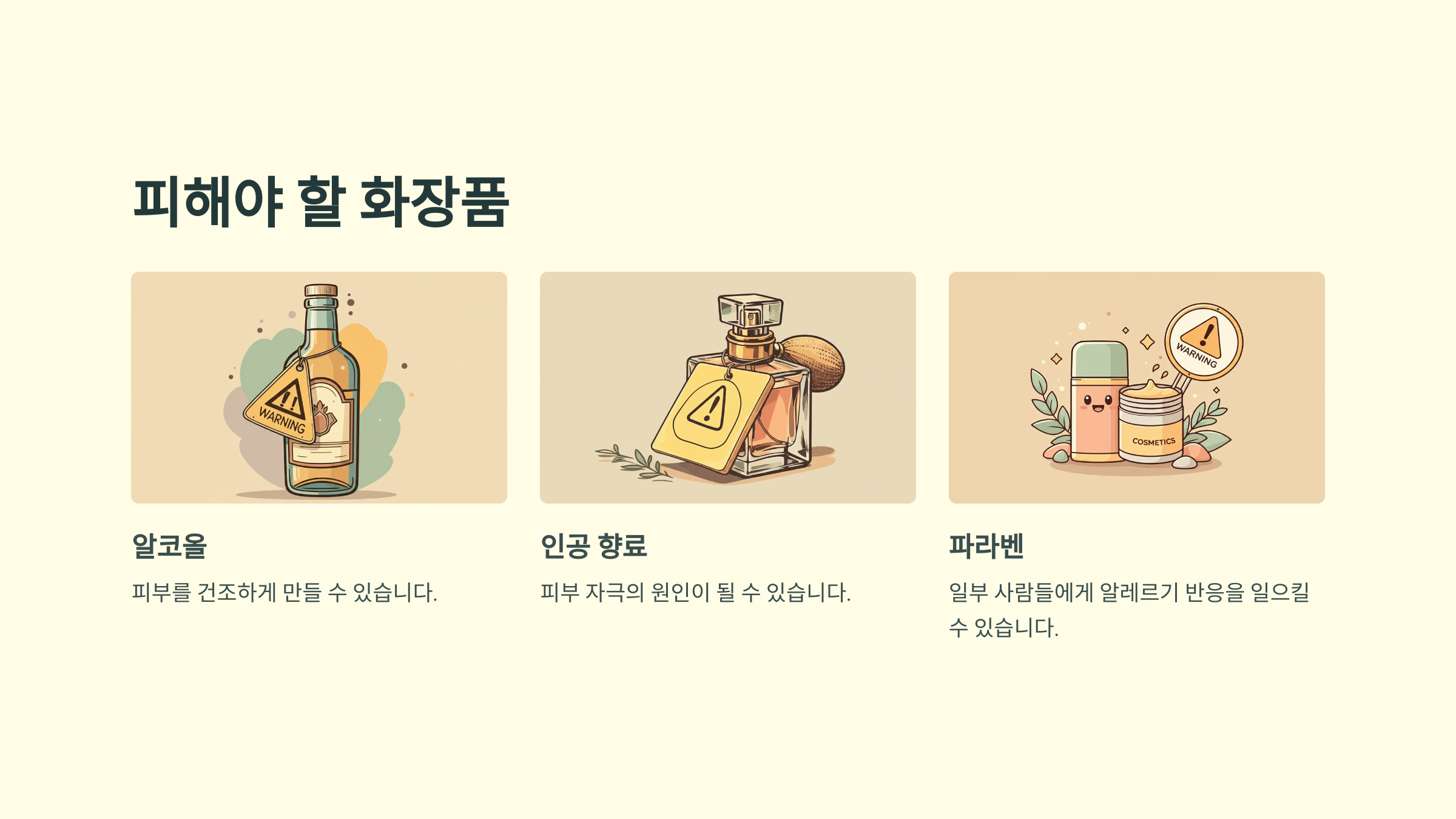 A: 알코올, 인공 향료, 파라벤과 같은 자극적인 성분이 포함된 화장품은 피하는 것이 좋습니다. 대신 저자극, 무향료 제품을 사용해 피부에 자극을 주지 않는 것이 중요합니다.