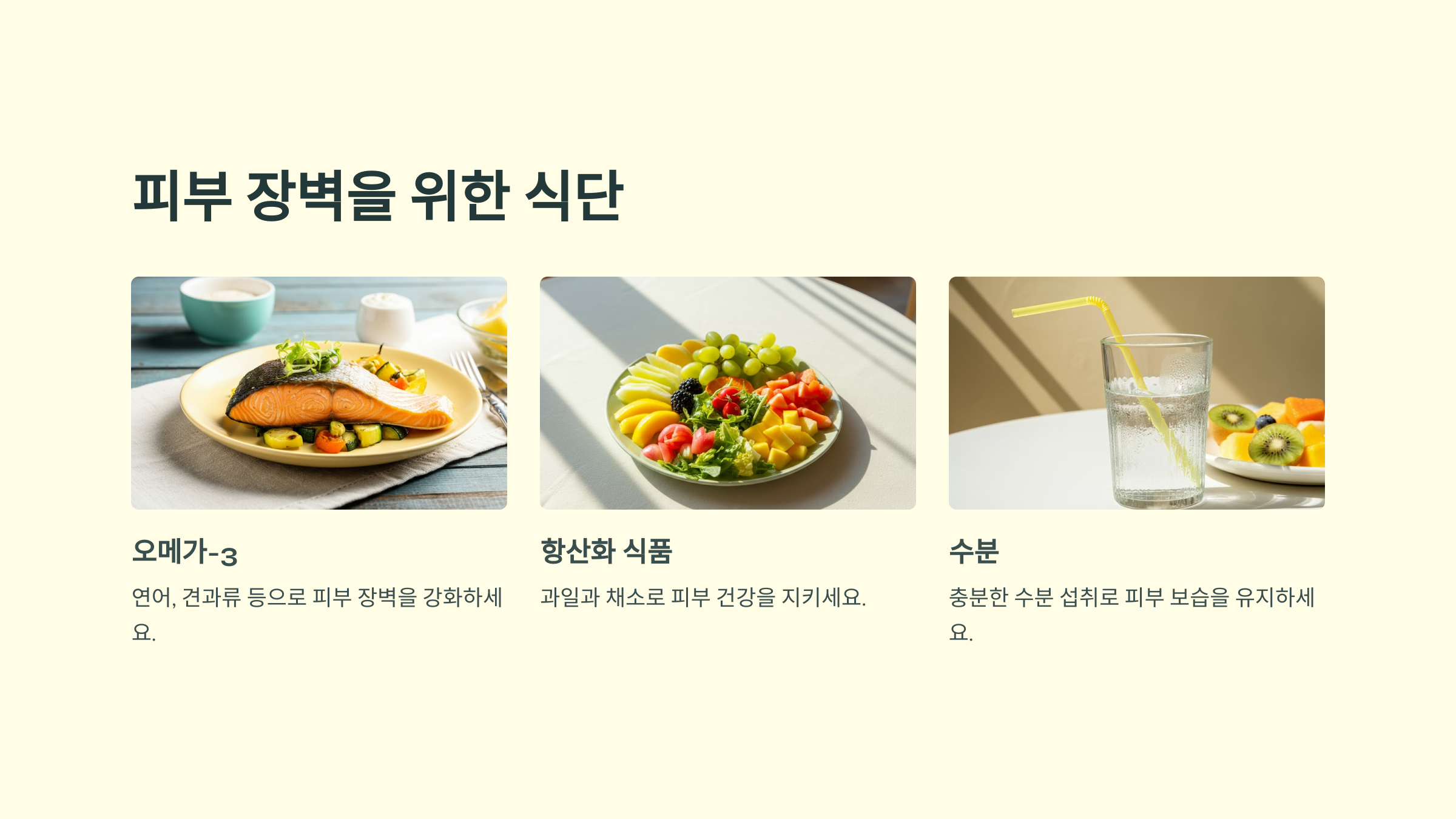 피부 장벽 강화는 단순히 외부적인 관리뿐만 아니라, 내부 건강도 중요합니다. 충분한 수분 섭취와 영양가 있는 음식을 통해 몸을 건강하게 유지하는 것이 필요합니다. 특히 오메가-3가 풍부한 음식을 섭취하면 피부에 유익한 지방산을 공급해 피부 장벽을 강화하는 데 도움이 됩니다.