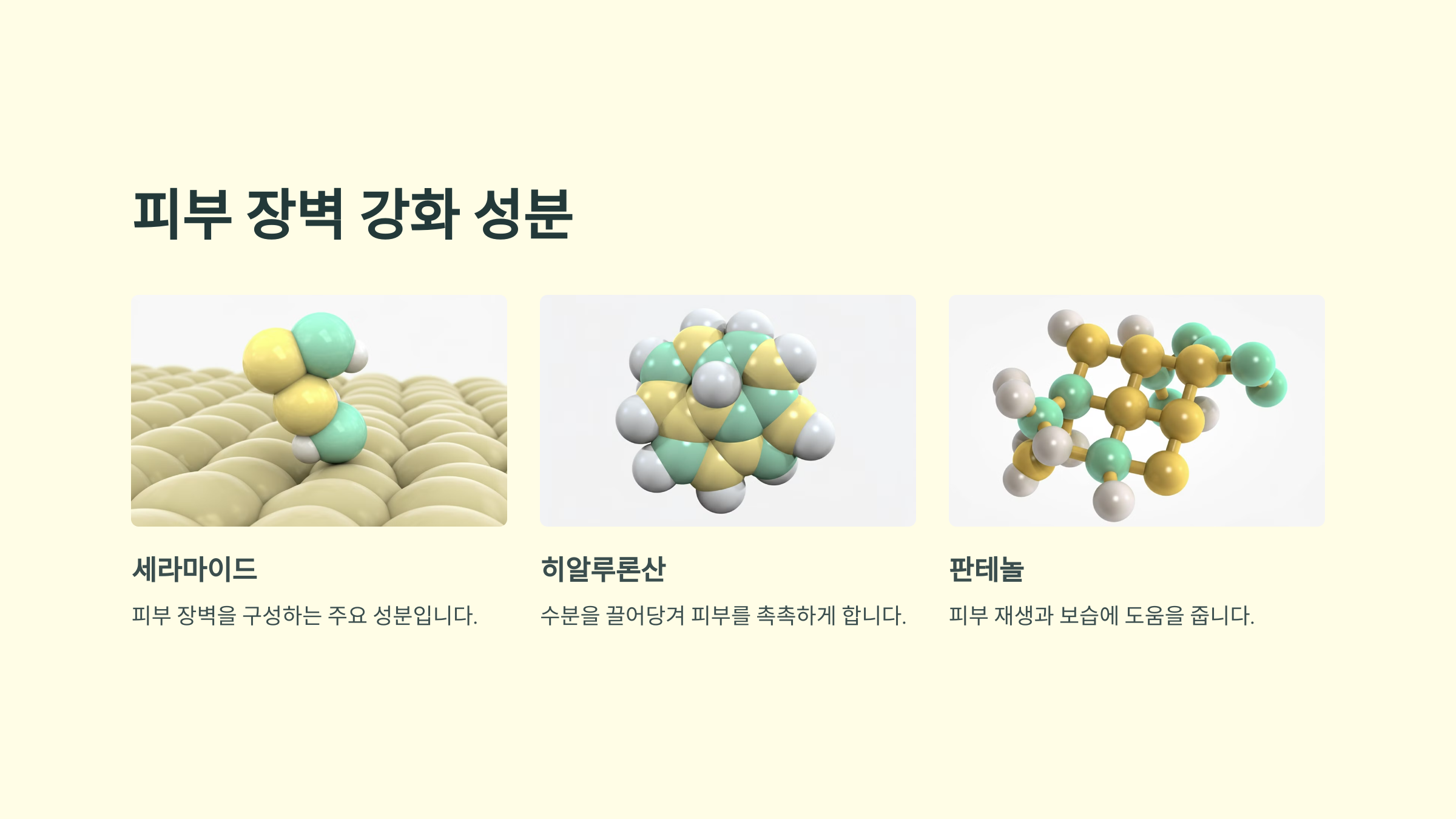 A: 피부 장벽을 강화하려면 세라마이드, 히알루론산, 판테놀 등의 성분이 포함된 보습제를 사용하는 것이 좋습니다. 이 성분들은 피부 장벽을 보호하고 회복시키는 데 중요한 역할을 합니다.