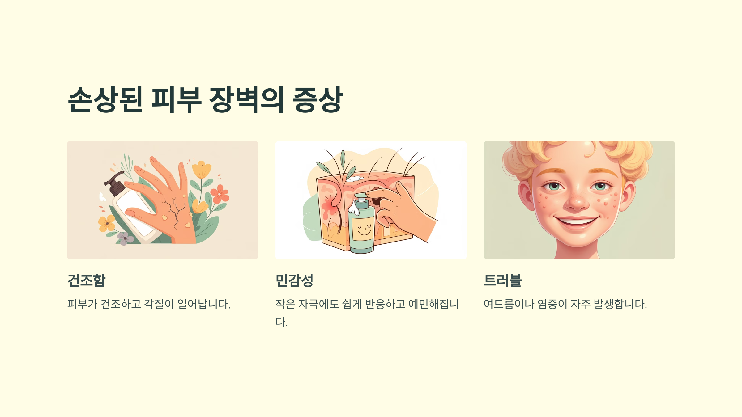 하지만 피부 장벽이 손상되면 피부의 보호 기능이 약해져 건조함, 가려움, 민감성 피부 같은 문제가 발생할 수 있습니다. 손상된 피부 장벽은 외부 자극에 쉽게 반응하며, 작은 자극에도 민감해지기 때문에 관리가 필수적입니다.