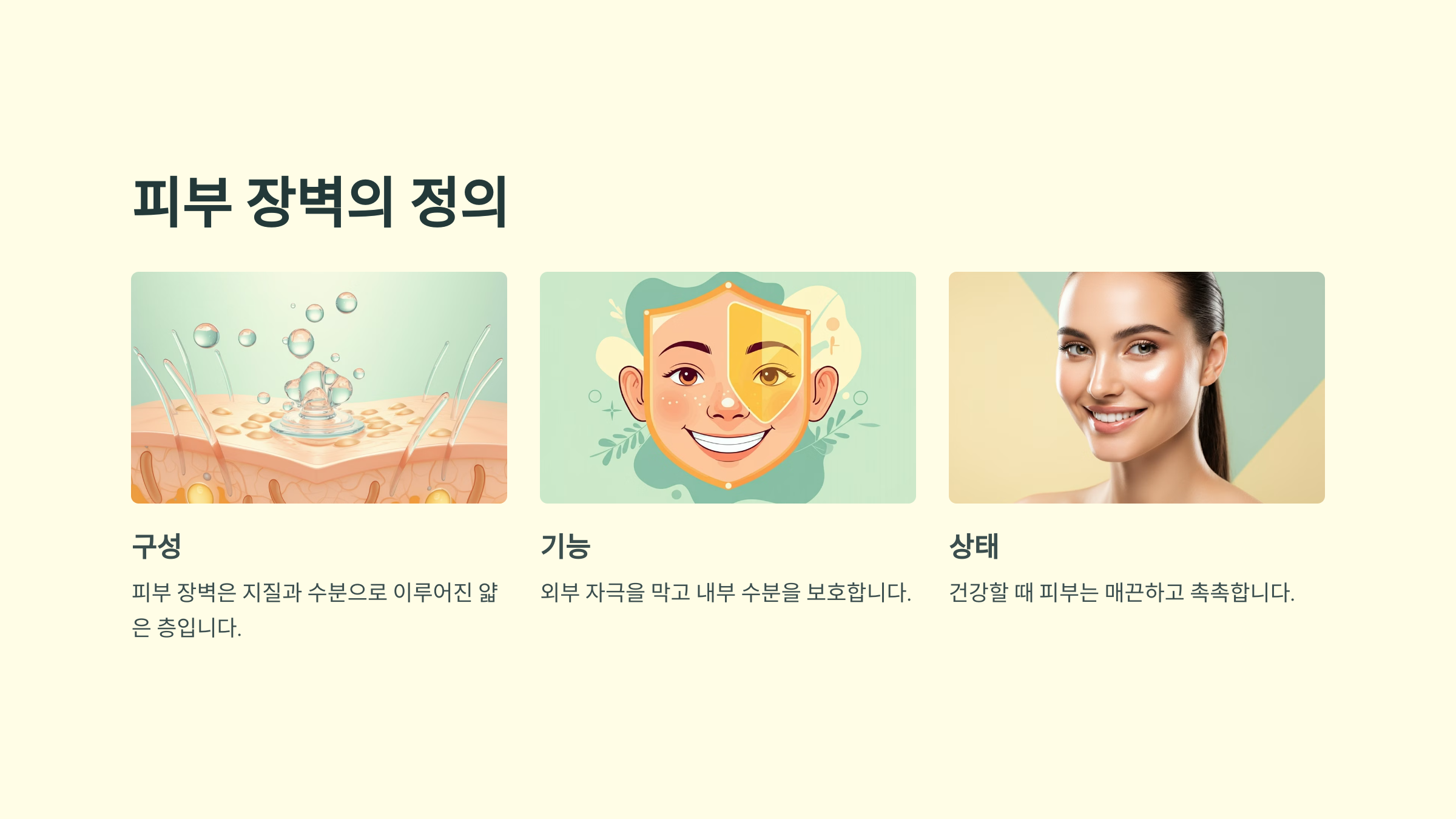 피부 장벽은 피부의 가장 바깥쪽에 있는 얇은 층으로, 주로 **지질(오일)**과 수분으로 이루어져 있습니다. 이 층은 피부가 외부 자극에 노출되지 않도록 막아주는 역할을 합니다. 외부의 먼지, 자외선, 유해한 미세먼지 등이 피부 속으로 침투하지 못하도록 하고, 내부의 수분이 증발하지 않도록 보호합니다. 그래서 피부 장벽이 건강할 때는 피부가 매끈하고 촉촉하며, 트러블이 잘 생기지 않습니다.