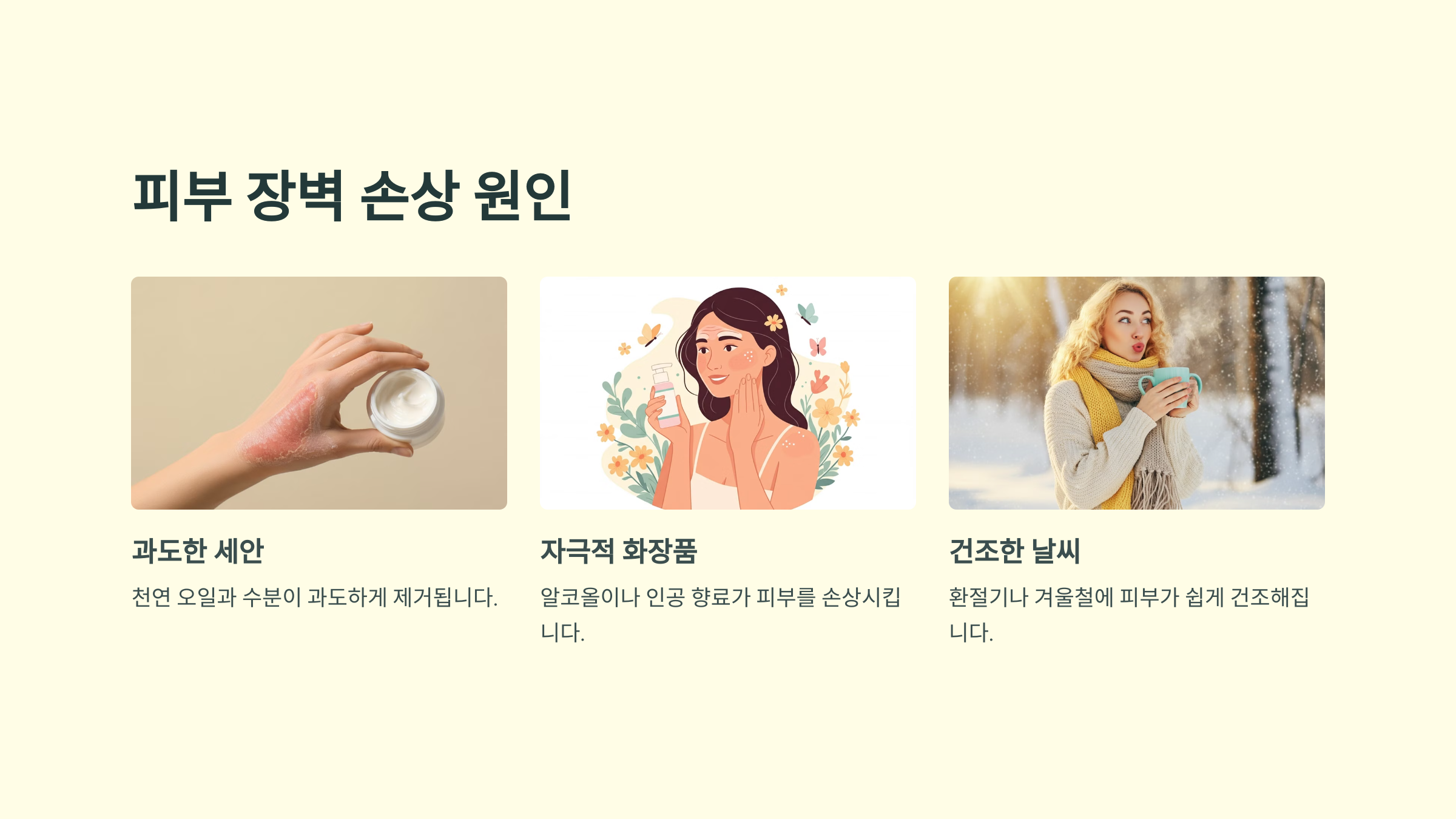 피부 장벽이 손상되는 주된 원인은 과도한 세안, 자극적인 화장품 사용, 건조한 날씨 등입니다. 세안 시 피부의 천연 오일과 수분이 너무 많이 제거되면, 피부 장벽이 약해질 수 있습니다. 또한, 알코올이나 인공 향료가 많이 들어간 자극적인 화장품을 자주 사용하면 피부가 손상되기 쉽습니다.