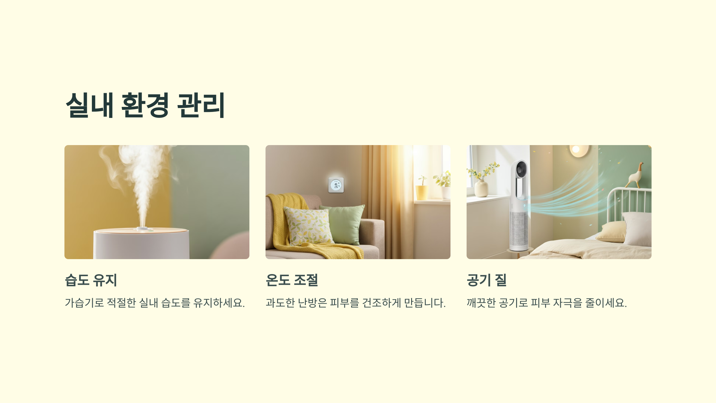 또한, 실내 습도를 적절하게 유지하는 것도 중요합니다. 건조한 실내 환경은 피부 장벽을 약화시키기 때문에 가습기를 사용해 실내 습도를 유지하는 것이 좋습니다.