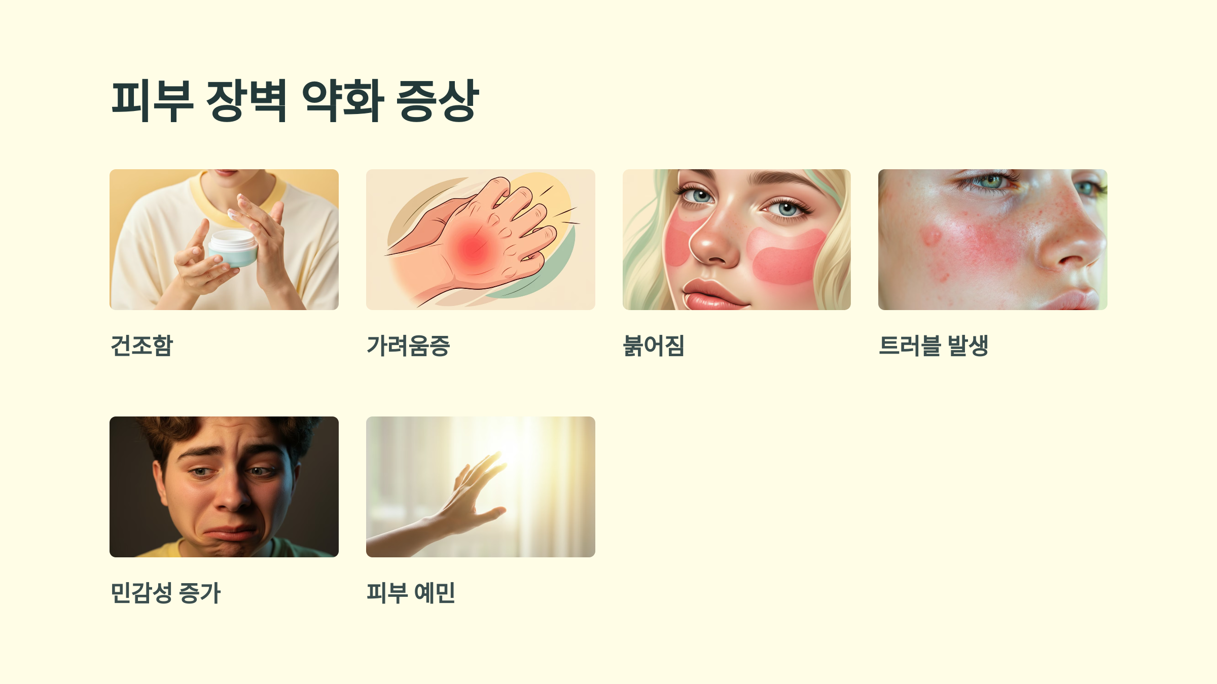 A: 피부 장벽이 약해지면 피부가 건조하고, 쉽게 자극을 받아 붉어지거나 가려움증이 생깁니다. 특히, 트러블이 자주 발생하거나 피부가 예민해지는 경우라면 피부 장벽이 손상되었을 가능성이 큽니다.