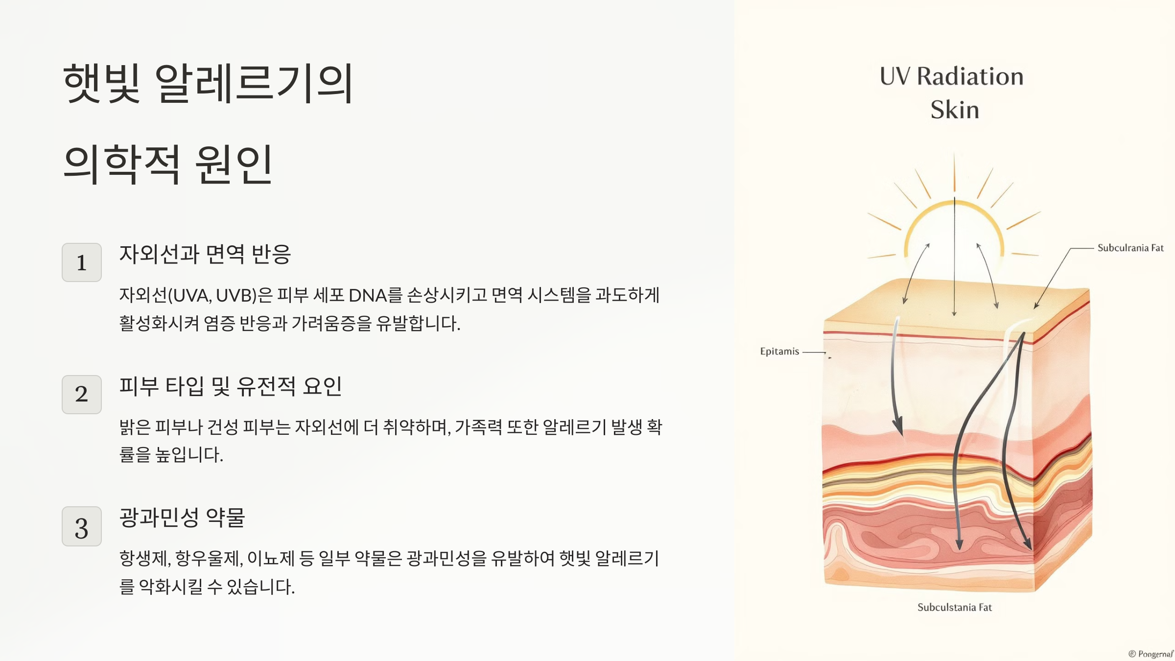 햇빛 알레르기는 주로 **자외선(UVA, UVB)**에 의해 발생합니다. 자외선이 피부에 닿으면 피부 세포의 DNA를 손상시키고, 이를 방어하기 위한 면역 시스템이 과잉 반응을 일으켜 염증과 가려움증을 유발합니다. 이때, 자외선에 민감한 사람들의 피부는 더욱 강하게 반응하며, 자극에 의해 히스타민이 분비되어 가려움증이 더욱 심화됩니다.