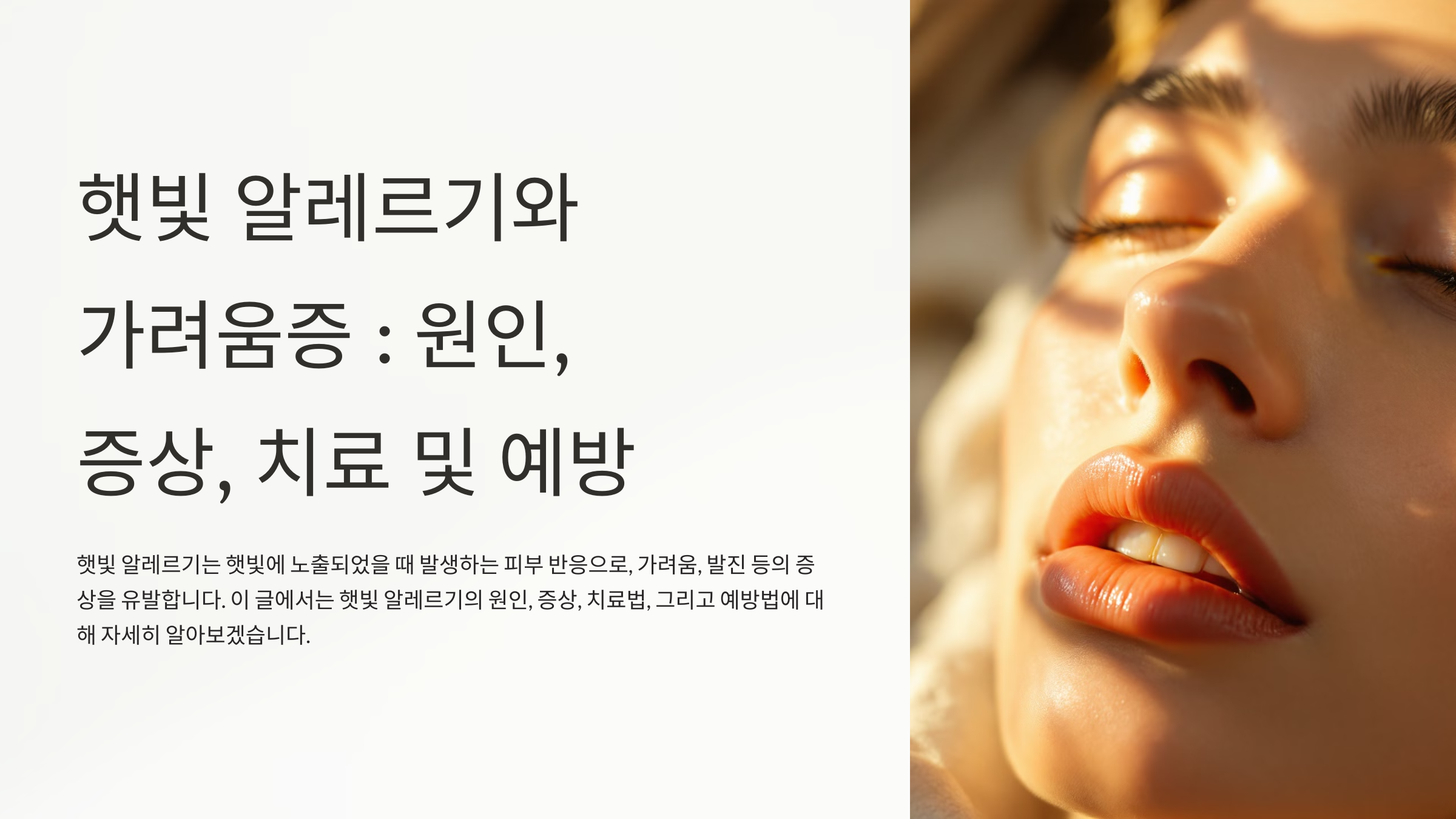햇빛에 잠깐만 노출돼도 피부가 가렵고 붉어지거나, 따가운 증상을 겪으신 적이 있으신가요? 이는 **햇빛 알레르기(Photosensitivity)**로 인해 발생할 수 있는 증상입니다. 햇빛 알레르기는 자외선에 노출되면 피부가 민감하게 반응하여 염증을 일으키는 현상으로, 가려움증이나 발진이 함께 나타나기도 합니다. 햇빛에 과도하게 노출될 때 이러한 증상은 더욱 심해질 수 있으며, 피부 건강에도 큰 영향을 미칠 수 있습니다. 오늘은 햇빛 알레르기의 원인과 가려움증의 의학적 치료법, 그리고 예방 방법에 대해 알아보겠습니다.