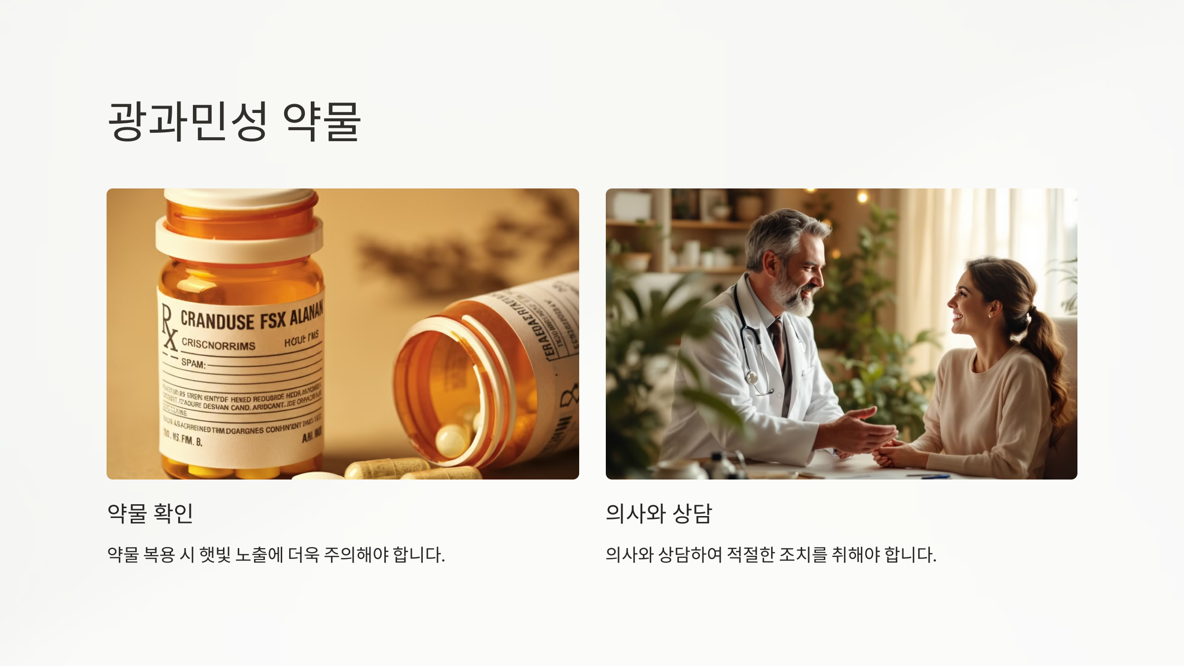 광과민성을 유발할 수 있는 약물을 복용 중인 경우, 반드시 의사에게 알리고 햇빛에 노출되지 않도록 주의해야 합니다. 필요하다면 대체 약물을 찾거나, 자외선 차단제를 철저히 사용해 햇빛 알레르기 반응을 예방할 수 있습니다.