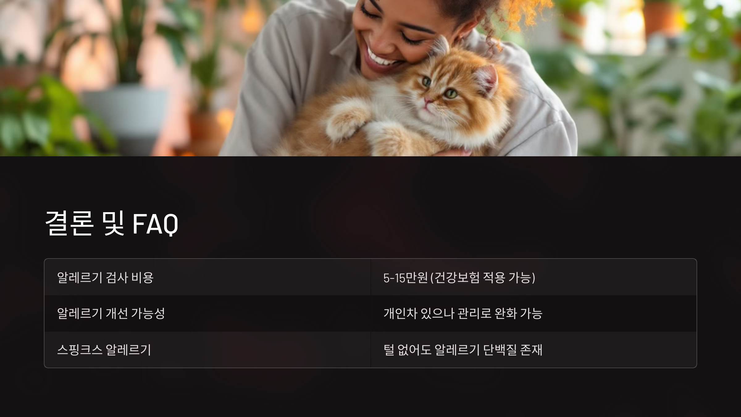 Q: 스핑크스는 정말 알레르기가 없나요? A: 털이 없어도 알레르기 단백질은 존재해요. 반드시 사전 테스트가 필요합니다.